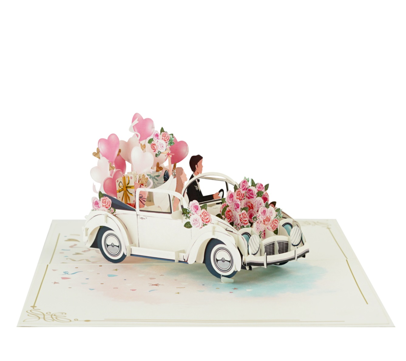 Tạo dấu ấn khó quên với thiệp 3D Pop Up xe cưới trắng Just Married. Khi mở ra, hình ảnh chiếc xe cưới bật nổi sang trọng, trang trí hoa hồng, bóng bay trái tim và quà tặng rực rỡ, kèm cặp đôi cô dâu chú rể hạnh phúc ngồi trên xe.