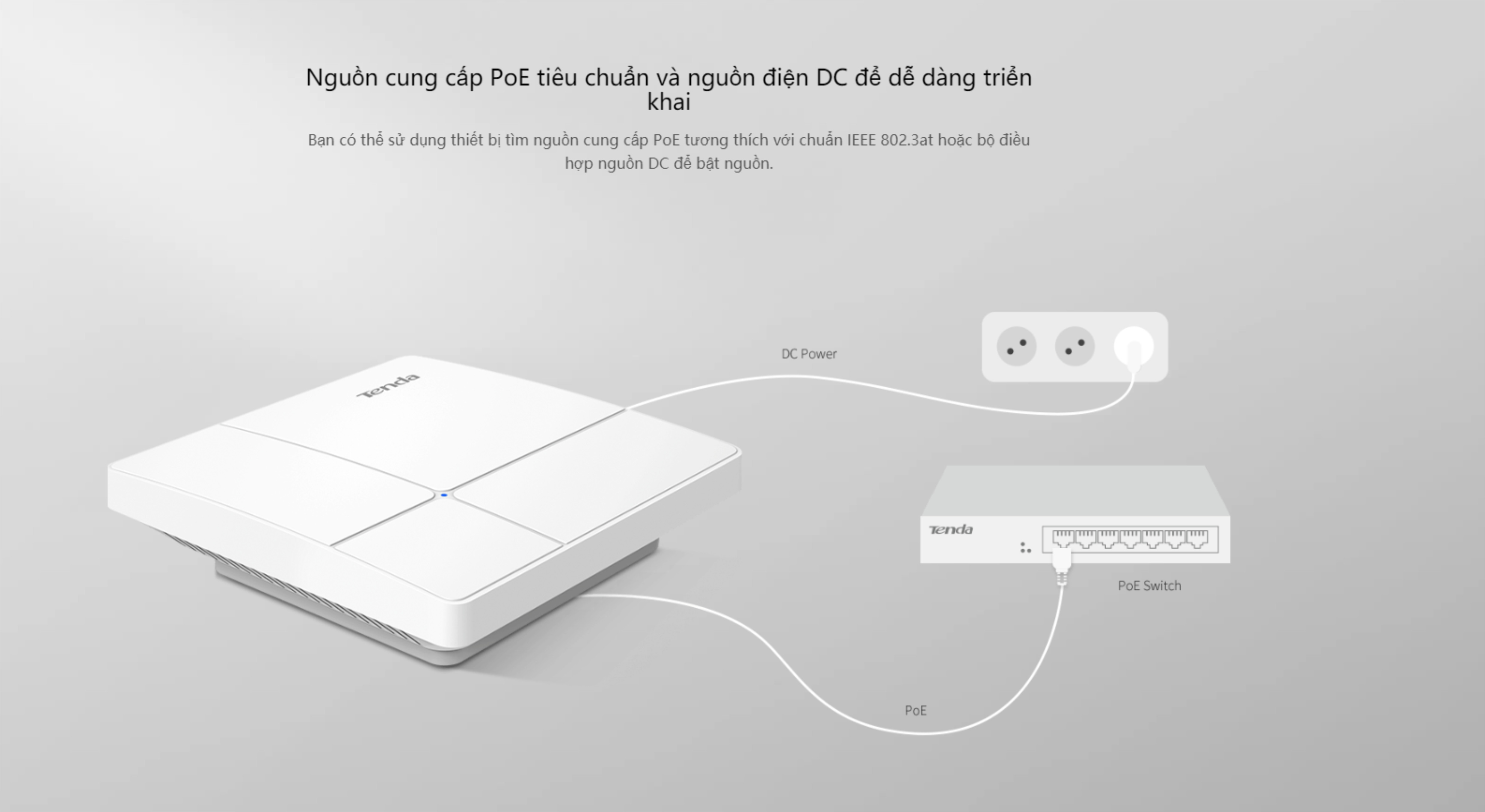 Tenda I24 dùng nguồn cung cấp PoE tiêu chuẩn và nguồn điện DC để dễ lắp đặt. Bạn có thể sử dụng thiết bị nguồn cung cấp PoE tương thích với chuẩn IEEE 802.3at hoặc bộ điều hợp nguồn DC để bật nguồn.