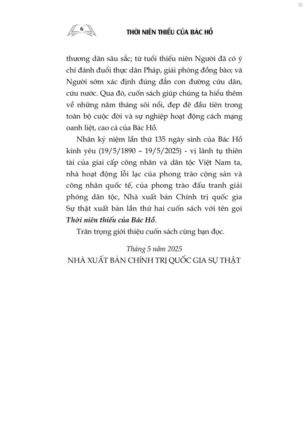 Mua tại TiktokNhân Kỷ niệm lần thứ 135 ngày sinh của Bác Hồ kính yêu (19/5/1890 – 19/5/2025) - Vị lãnh tụ thiên tài của giai cấp công nhân và dân tộc Việt Nam ta, nhà hoạt động lỗi lạc của phong trào cộng sản và công nhân quốc tế, của phong trào đấu tranh giải phóng dân tộc, Nhà xuất bản Chính trị quốc gia Sự thật xuất bản lần thứ hai cuốn sách với tên gọi Thời niên thiếu của Bác Hồ. Trân trọng giới thiệu cuốn sách cùng bạn đọc