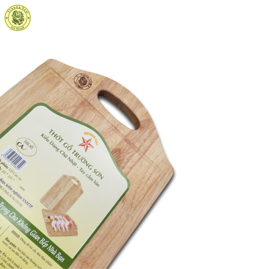 Thớt Gỗ Cao Su Chữ Nhật Quai Cầm được làm từ khối gỗ cao su, đẹp và chắc chắn, gia công cẩn thận, sắc xảo.