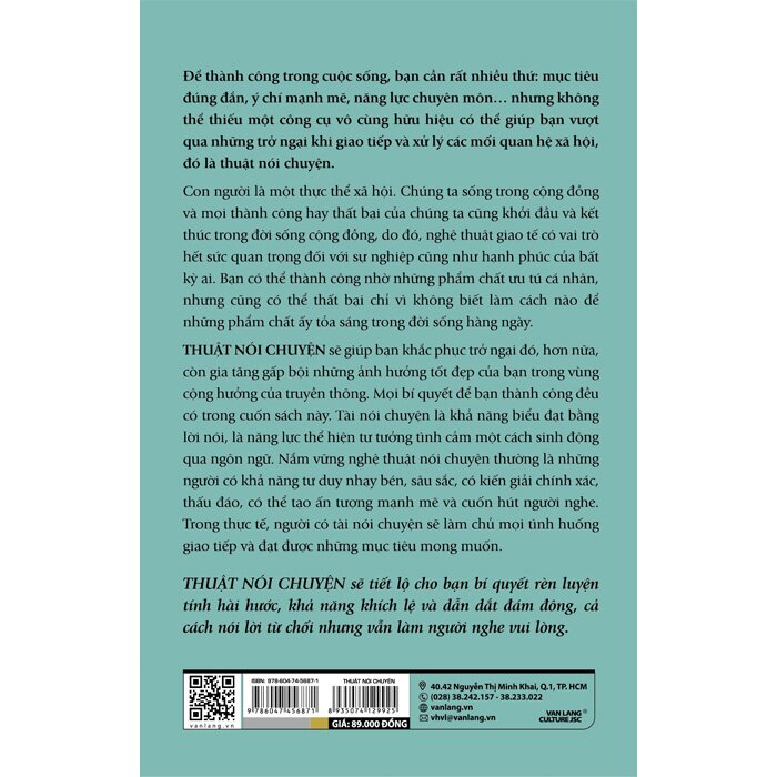 sẽ giúp bạn khắc phục trở ngại đó, hơn nữa, còn gia tăng gấp bội những ảnh hưởng tốt đẹp của bạn trong vùng cộng hưởng của truyền thông. Mọi bí quyết để bạn thành công đều có trong cuốn sách này. Tài nói chuyện là khả năng biểu đạt bằng lời nói, là năng lực thể hiện tư tưởng tình cảm một cách sinh động qua ngôn ngữ. Nắm vững nghệ thuật nói chuyện thường là những người có khả năng tư duy nhạy bén, sâu sắc, có kiến giải chính xác, thấu đáo, có thể tạo ấn tượng mạnh mẽ và cuốn hút người nghe. Trong thực tế, người có tài nói chuyện sẽ làm chủ mọi tình huống giao tiếp và đạt được những mục tiêu mong muốn.