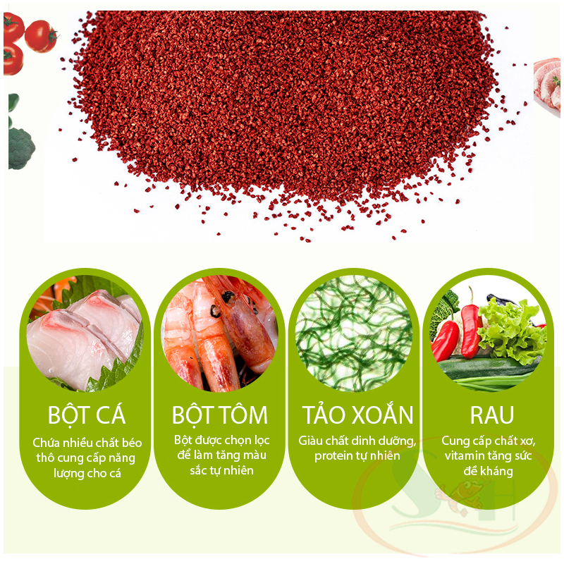 Thành phần: bột cá trắng, mầm lúa mì, bột tôm, men chất lượng cao, bột mì, đậu tương đã khử muối, tảo spirulina, rong biển, astaxanthin, nhiều loại vitamin và khoáng chất tự nhiên...