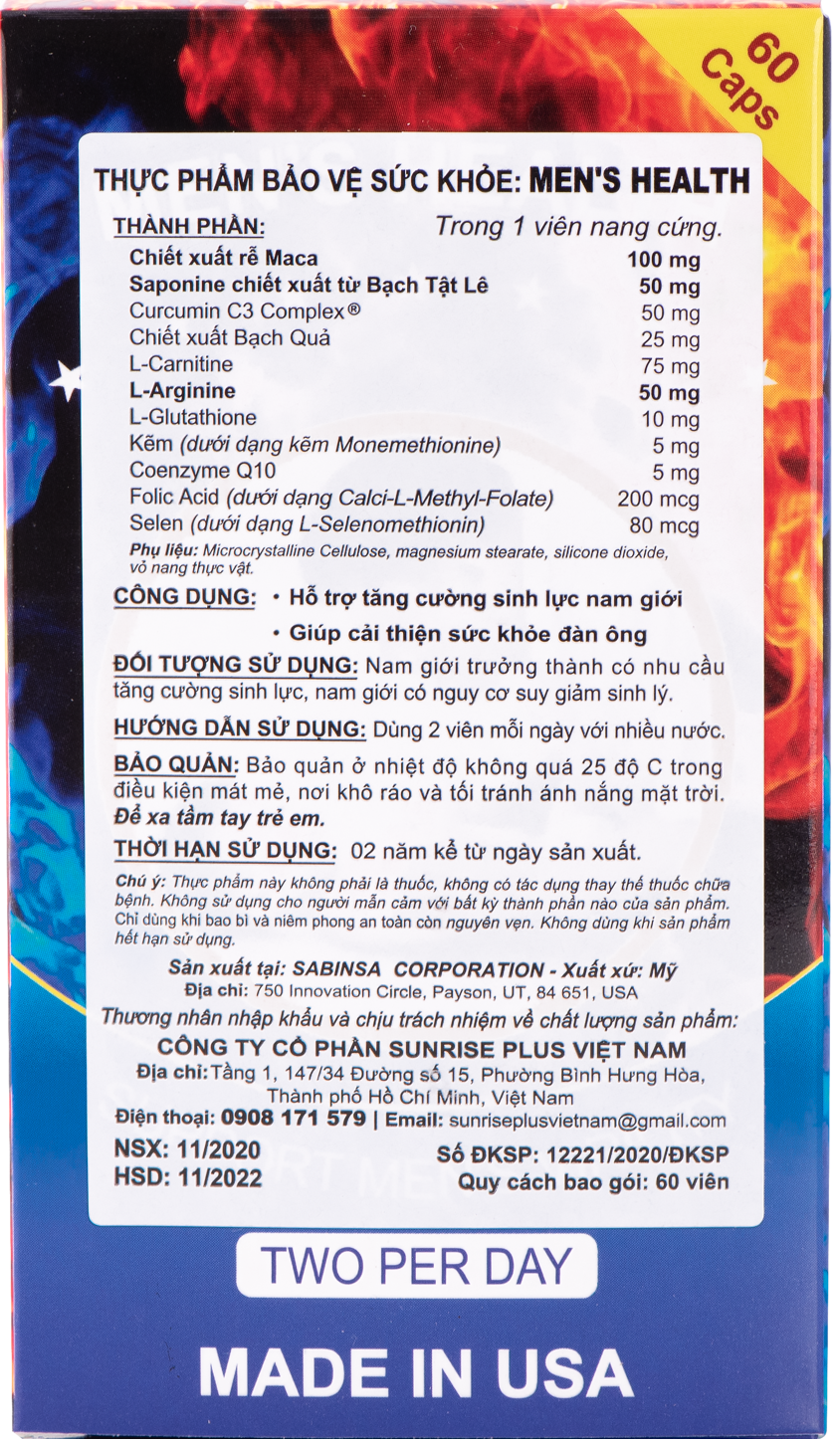 Thành phần: Chiết xuất rễ maca, saponine chiết xuất từ Bạch Tật Lê, Curcumin C3 Complex, Chiết xuất bạch quả, L-Arginine, L-Carnitine, L-Glutathione, Kẽm, Coenzyme Q10, Folic Acid, Selen,