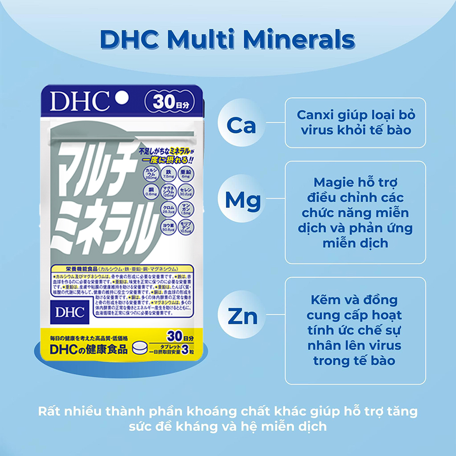 Thực phẩm chức năng viên uống khoáng tổng hợp DHC Multi Minerals bổ sung 10 loại khoáng chất mà cơ thể dễ bị thiếu hụt: canxi, sắt, kẽm, đồng, magie, crom, selen, mangan, molybdneum, iot.
