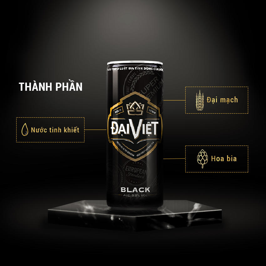 - Hương vị đậm đà: Được nấu từ đại mạch và hoa bia cao cấp, Đại Việt Black có vị đắng dịu, thơm nhẹ, mang đậm chất bia Đức.
