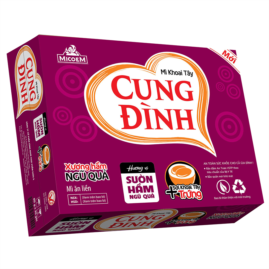 Thùng 30 Gói Mì Khoai Tây Cung Đình Hương Vị Sườn Hầm Ngũ quả với hương vị thơm ngon, kích thích vị giác. Cung cấp nguồn năng lượng dồi dào. Sản phẩm được đóng gói