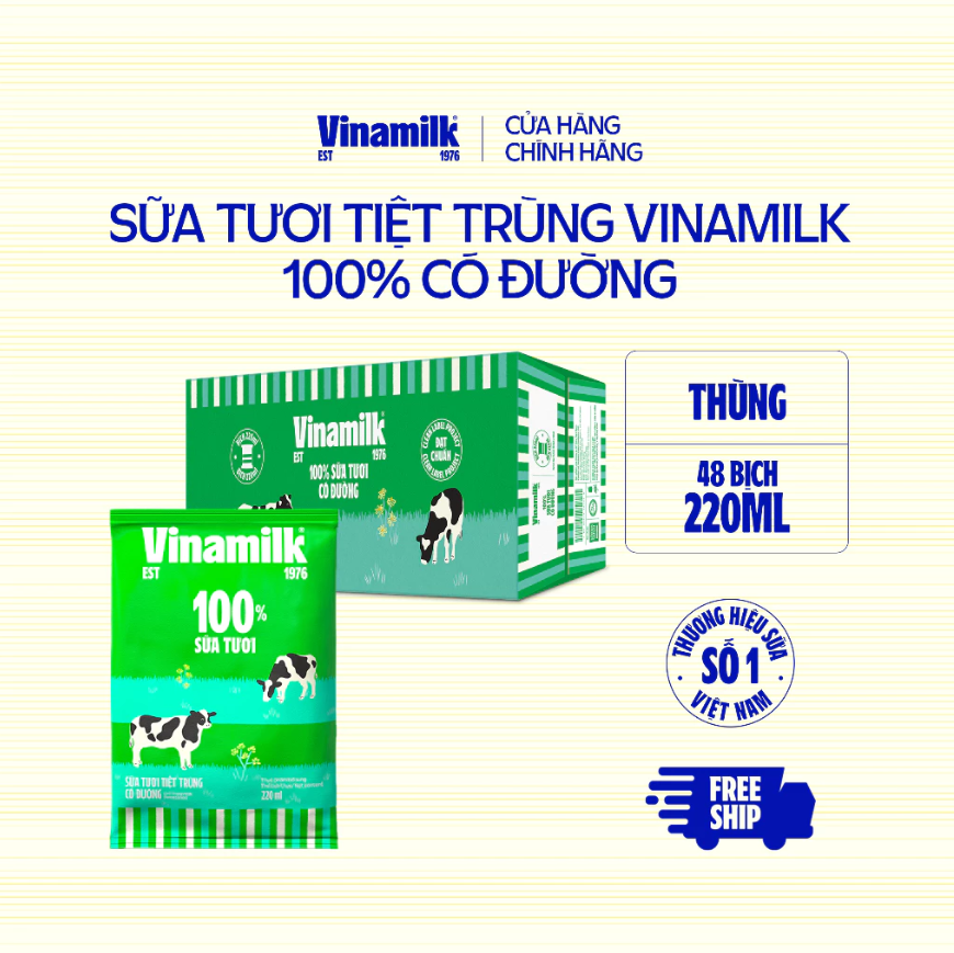 ✨Thùng 48 Bịch Sữa Tươi Tiệt Trùng Vinamilk 100% Có Đường (220ml)