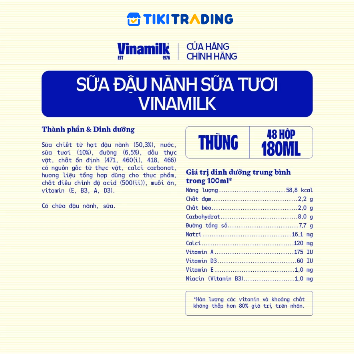 Mua tại Tiktok[CÓ THỂ NHẬN BB MỚI/CŨ] : Sữa đậu nành Tươi Vinamilk 180ml • Được bổ sung sữa tươi, giúp nạp năng lượng, giảm mệt mỏi. • Gấp đôi Canxi cho xương chắc khỏe • Hạt đậu nành không biến đổi gen