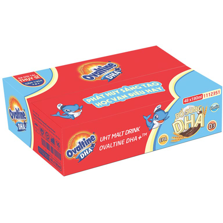 THỨC UỐNG LÚA MẠCH HƯƠNG VỊ SÔ-CÔ-LA OVALTINE DHA+ 180ML (Thùng 48 Hộp) Ovaltine mới gấp 4 lần canxi (so với sản phẩm Ovaltine trước tháng 7 2021) "Ovaltine" là nhãn hiệu thuốc quyền sở hữu của Công ty R Twinning and