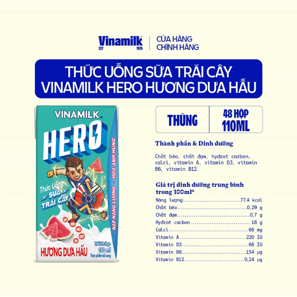 - Thức uống Sữa trái cây Vinamilk Hero mới ngon tuyệt! Với Canxi & Vitamin D3 giúp xương chắc khỏe, Vitamin A cho đôi mắt sáng tinh anh cùng các vitamin nhóm B, giúp trẻ luôn tràn đầy năng lượng và sảng khoái.