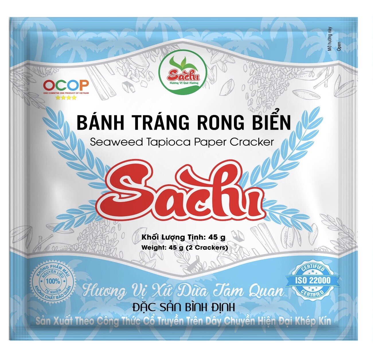 Bánh tráng gạo mỏng Sachi là món ăn không thể thiếu của người dân Bình Định, trong các dịp lễ cũng như các bửa ăn ngày thường. Thành phần: Gạo 93%, tinh bột mì, muối.
