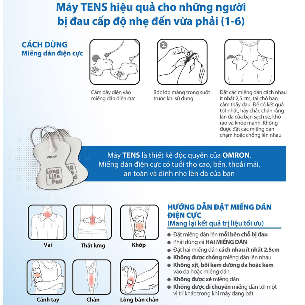 có 5 chế độ để điều trị cho nhiều vùng khác nhau trên cơ thể như: vai, cánh tay, lưng dưới, chân hoặc bàn chân. 10 cường độ từ thấp tới cao để t.rị liệu giảm đau cơ hiệu quả hơn.