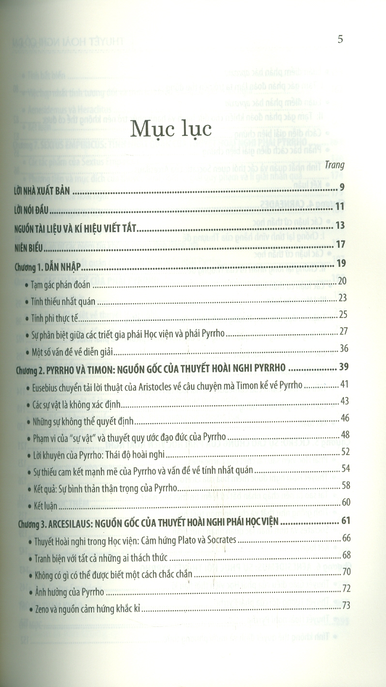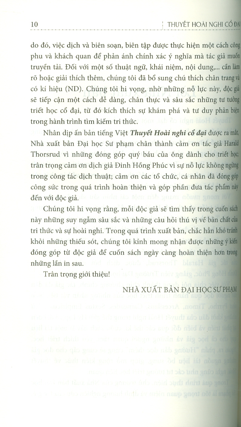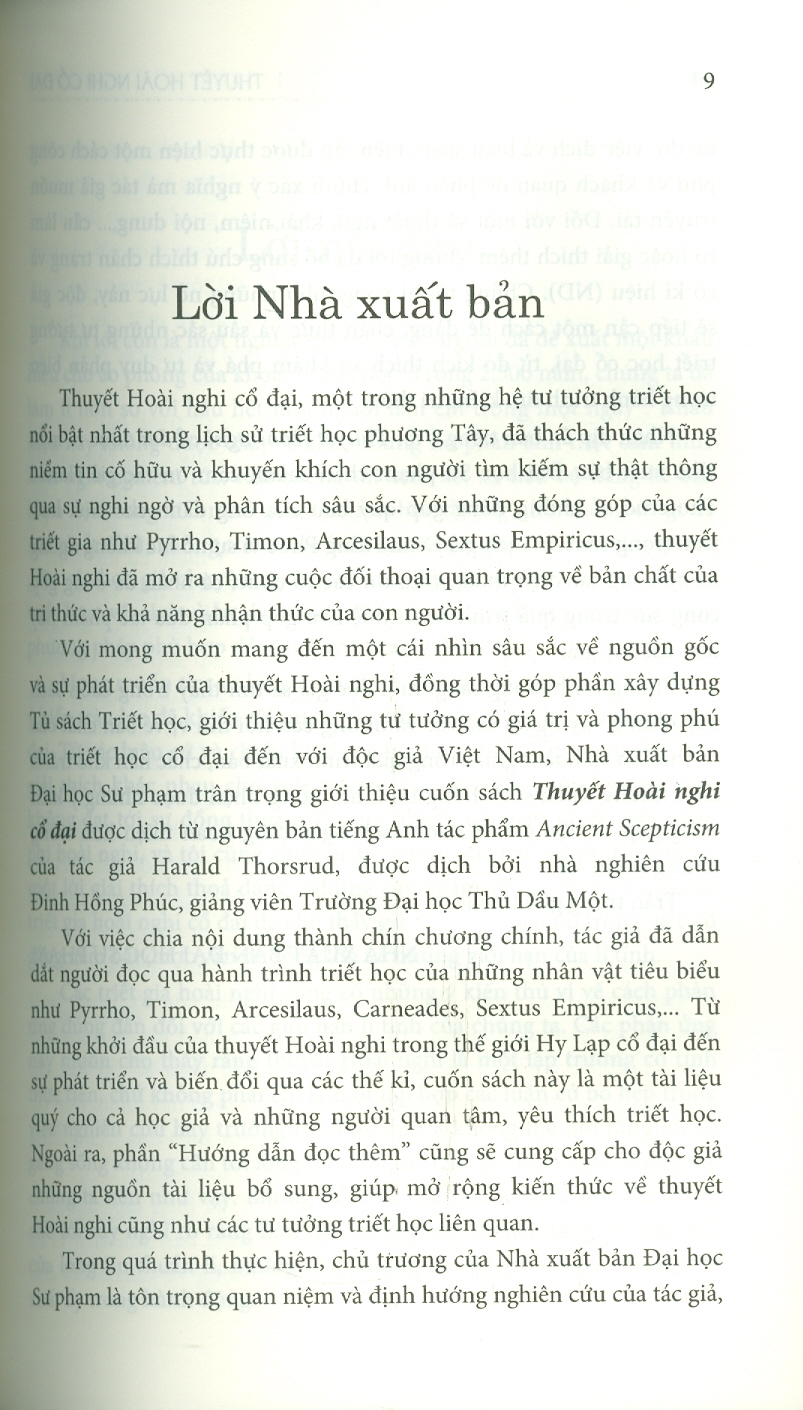 Thuyết Hoài nghi cổ đại, một trong những hệ tư tưởng triết học nổi bật nhất trong lịch sử triết học phương Tây, đã thách thức những niềm tin cố hữu và khuyến khích con người tìm kiếm sự thật thông qua sự nghi ngờ và phân tích sâu sắc. Thuyết Hoài nghi cổ đại có nội dung được chia thành chín chương chính, tác giả đã dẫn dắt người đọc qua hành trình triết học của những nhân vật tiêu biểu như Pyrrho, Timon, Arcesilaus, Carneades và Sextus Empiricus,... Từ những khởi đầu của thuyết Hoài nghi trong thế giới Hy Lạp cổ đại đến sự phát triển và biến đổi qua các thế kỉ, cuốn sách này là một tài liệu quý giá cho cả học giả và những người quan tâm, yêu thích triết học. Ngoài ra, phần “Hướng dẫn đọc thêm” cũng sẽ cung cấp cho độc giả những nguồn tài liệu bổ sung, giúp mở rộng kiến thức về thuyết Hoài nghi cũng như các tư tưởng triết học liên quan.