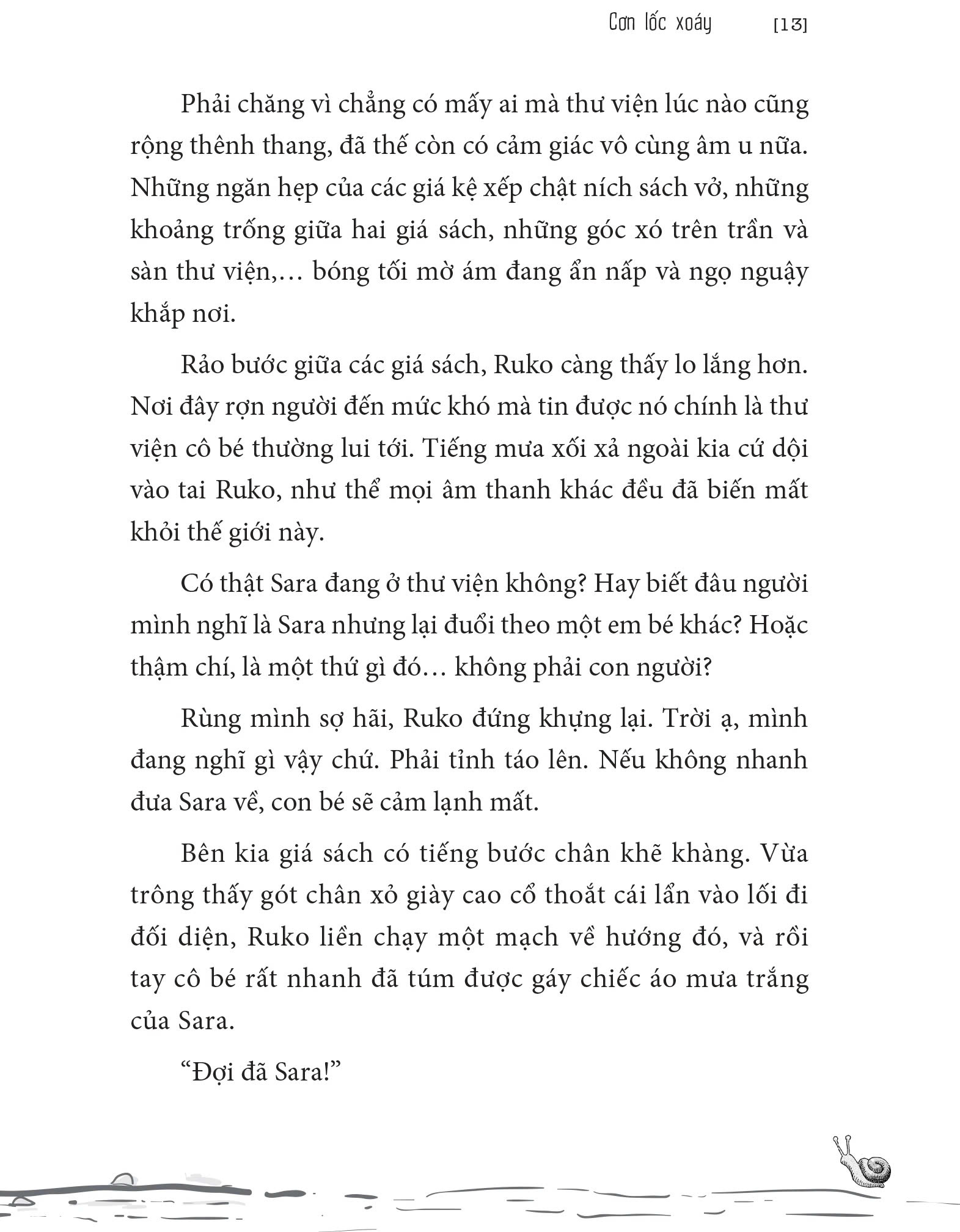 “Trời mưa, trời mưa Rơi rơi rơi rơi Hãy đưa ta tới Tiệm sách Cơn Mưa!” Tiệm sách cơn mưa - Cơn lốc xoáy nằm trong series Tiệm sách cơn mưa của tác giả Reiko Hinata và được minh họa bởi họa sĩ Hisanori Yoshida. Trong 2 phần đầu của “Tiệm sách cơn mưa” Ruko cùng em gái Sara đã trải qua những chuyến phiêu lưu để khám phá ý nghĩa của những trang sách và tìm thấy giá trị của ước mơ cùng trí tưởng tượng. Trong tập 3 “Cơn lốc xoáy” độc giả lại có cơ hội cùng các nhân vật trong sách khám phá ra giá trị đích thực của tình bạn bằng một chuyến phiêu lưu không kém phần hấp dẫn. Chuyến phiêu lưu thứ ba bắt đầu khi Ruko và em gái đến tiệm sách chơi như thường lệ và phát hiện ra ông chủ tiệm sách Cơn Mưa - Fuhuron đang mắc một căn bệnh cảm quái lạ. Căn bệnh này là một lời nguyền, đe dọa đến an nguy của cả thế giới. Trong khi cô trợ lý Maimaiko và anh vũ đồng Den lên đường tìm thuốc giải, Ruko và em gái lại bị một vị khách bắt cóc. Hành trình thoát khỏi hiểm nguy, cứu lấy ông Fuhuron và thế giới gian nan hơn những gì Ruko tưởng rất nhiều.  Chuyến phiêu lưu nào rồi cũng sẽ có người tốt giúp đỡ, nhưng liệu những người bạn mới sắp xuất hiện đây có thật lòng muốn giúp Ruko? Món quà thực sự của tình bạn là gì? Ruko của chúng ta đã đủ dũng cảm và tự tin để đón nhận nó hay chưa? Mời các bạn đọc nhỏ tuổi cùng bước vào một chuyến phiêu lưu nhiều bất ngờ và giàu ý nghĩa nữa với Ruko nhé.