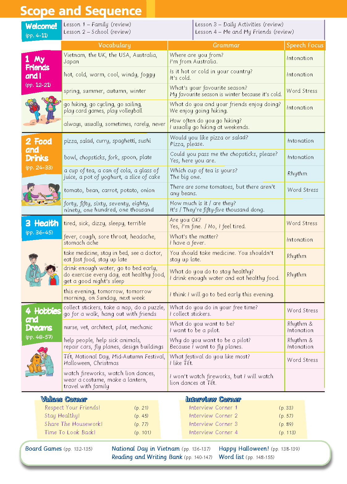 Sách: Learning English 4 - Dành Cho Học Sinh Lớp 4 NỘI DUNG VÀ CẤU TRÚC CỦA QUYỂN SÁCH : Bảng mục lục: Chỉ rõ các mục tiêu chính và trọng tâm của mỗi bài