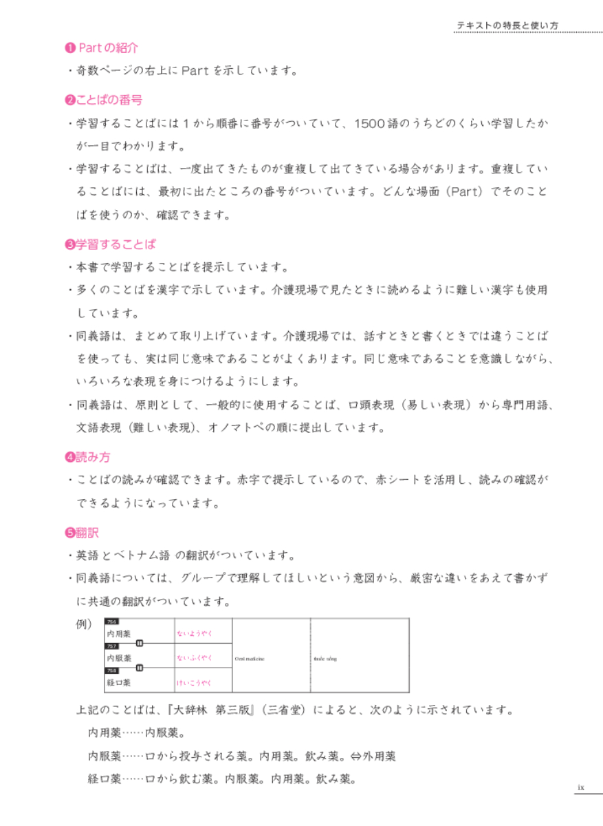 Nằm trong bộ sách Tiếng Nhật chuyên ngành điều dưỡng. Quyển "Từ vựng cơ bản" này là tổng hợp các từ vựng chuyên ngành điều dưỡng, kèm bản dịch Anh Việt và các câu ví dụ bám sát hiện trường làm việc thực tế. Giúp người học có cái nhìn tổng quát về ngành điều dưỡng. Có đính kèm tấm nhựa đỏ phục vụ việc tự học. Đây là giáo trình rất bổ ích cho những người đang học ngành điều dưỡng, hoặc muốn làm việc trong ngành điều dưỡng tại Nhật Bản.