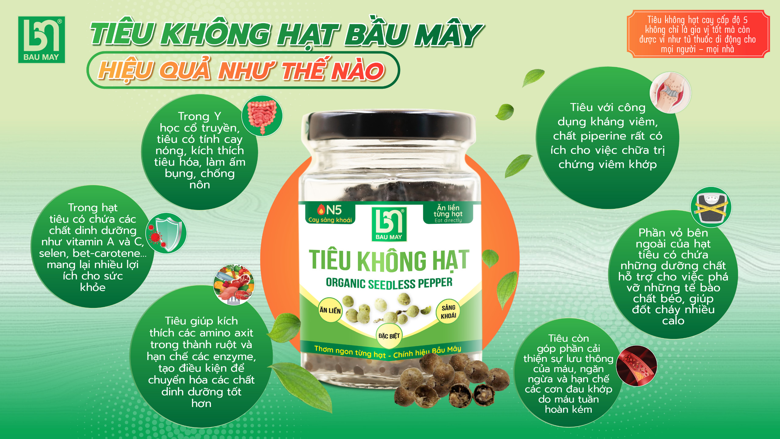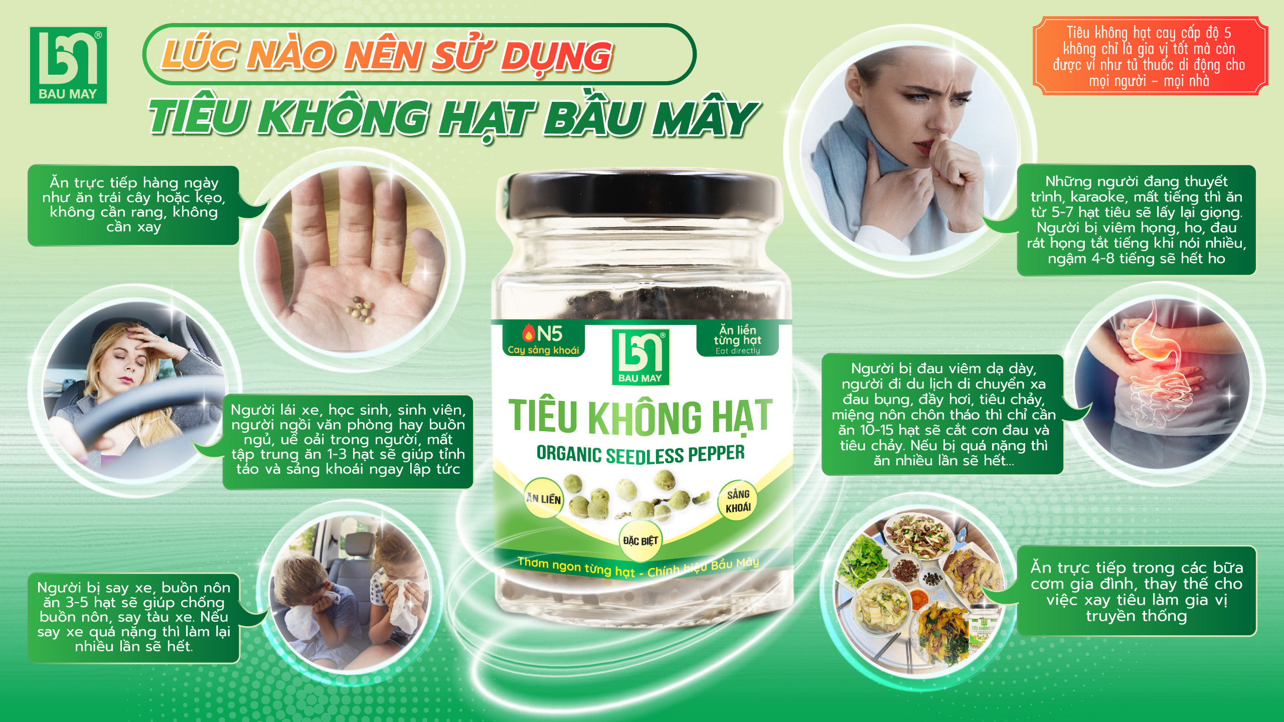 Tiêu không hạt Organic Bầu Mây 15g - Cay cấp độ 5 với độ cay giòn đặc biệt sảng khoái ví như tủ thuốc di dộng giúp Kích thích ăn uống và cải thiện hệ tiêu hóa, Chống buồn ngủ, giúp tỉnh táo khi làm việc và say tàu xeTiêu không hạt Organic Bầu Mây 15g - Cay cấp độ 5 với độ cay giòn đặc biệt sảng khoái ví như tủ thuốc di dộng giúp Kích thích ăn uống và cải thiện hệ tiêu hóa, Chống buồn ngủ, giúp tỉnh táo khi làm việc và say tàu xeTiêu không hạt Organic Bầu Mây 15g - Cay cấp độ 5 với độ cay giòn đặc biệt sảng khoái ví như tủ thuốc di dộng giúp Kích thích ăn uống và cải thiện hệ tiêu hóa, Chống buồn ngủ, giúp tỉnh táo khi làm việc và say tàu xeTiêu không hạt Organic Bầu Mây 15g - Cay cấp độ 5 với độ cay giòn đặc biệt sảng khoái ví như tủ thuốc di dộng giúp Kích thích ăn uống và cải thiện hệ tiêu hóa, Chống buồn ngủ, giúp tỉnh táo khi làm việc và say tàu xe