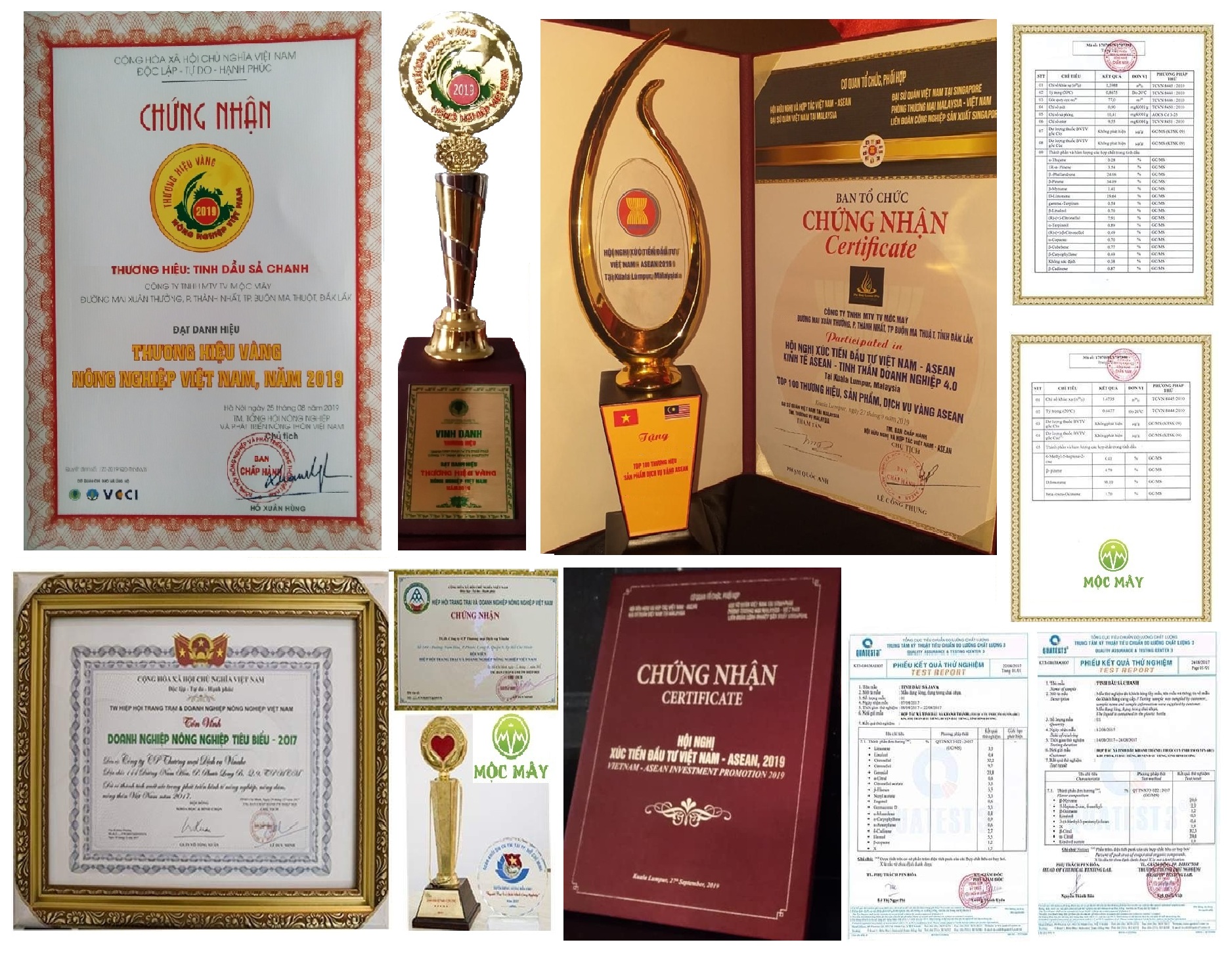 ĐÔI NÉT VỀ MỘC MÂY FARM   Mộc Mây Farm là xưởng sản xuất tinh dầu có thể nói là lớn nhất Việt Nam hiện nay. Cùng với đội ngũ kĩ sư giàu kinh nghiệm. Nay chúng tôi cho ra đời tinh dầu tràm gió nguyên chất 100% đạt chuẩn Organic hữu cơ đã được kiểm nghiệm từ mẫu đất trồng, nguồn nước tưới theo tiêu chuẩn Organic, bón phân hữu cơ, ko sử dụng hóa chất, kích thích tăng trưởng. Và được  sản xuất với quy trình công nghệ cao trên dây chuyền thiết bị hiện đại tại nhà máy đạt tiêu chuẩn dược mỹ  phẩm GMP (Good Manufacturing Practices). Lò chưng cất hiện đại dùng điện 3pha, được chế tạo bằng inox cao cấp dùng trong y dược để tránh ra ten làm tinh dầu bị nhiễm kim loại nặng, mất đi tinh chất, mùi hương vốn có của tinh dầu trong quá trình chưng cất, tất cả đều đạt tiêu chuẩn xuất khẩu của trung tâm giám định Vinacontrol, Quatest3, Bộ y tế…và được tôn vinh trong lễ trao giải doanh nghiệp nông nghiệp tiêu biểu 2017,  top 100 thương hiệu vàng nông nghiệp VN 2019, top 10 thương hiệu mạnh đất Việt 2020 và một số giải thưởng khác...và một số giải thưởng khác. Hiện tại chúng tôi đang bán sỉ cho hầu hết các đại lý lớn nhỏ và nhiều Cty dược, mỹ phẩm trong và ngoài nước   ***Nếu các bạn đã từng sử dụng các loại tinh dầu ở nhiều nơi. Nay hãy cảm nhận sự khác biệt đến từ Mộc Mây Farm với triết lý đem tinh dầu Việt vươn xa thế giới. Mộc Mây Farm: “ nông trại của những mùi hương”