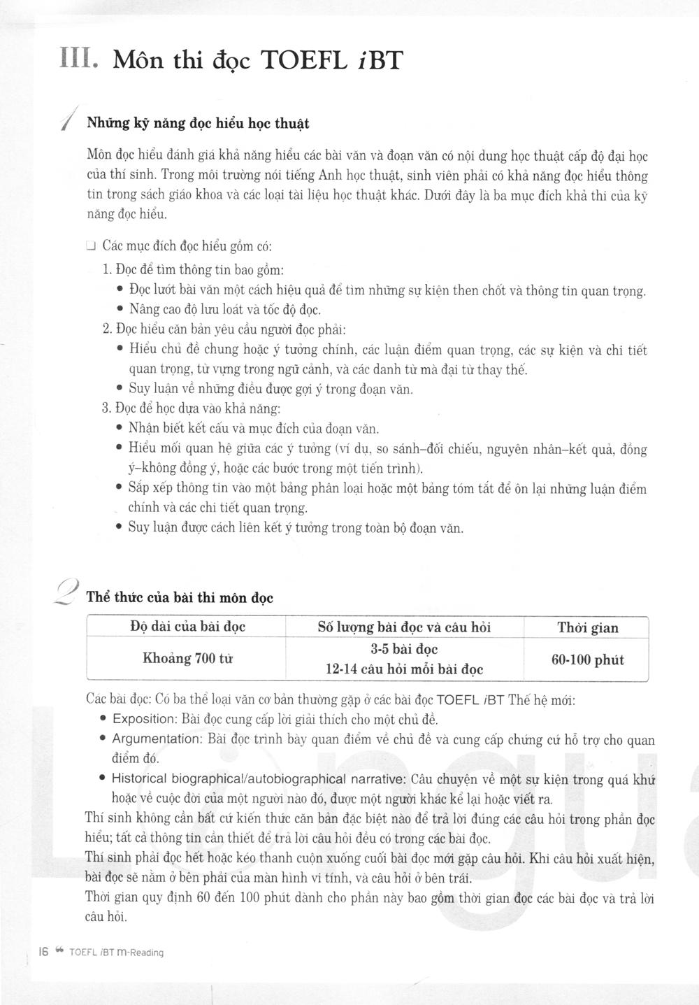 TOEFL iBT M - Reading được biên soạn nhắm đến đối tượng là học viên ở trình độ trung cấp. Phần nội dung bao gồm 8 chương đựơc chia thành 3 chủ điểm lớn: