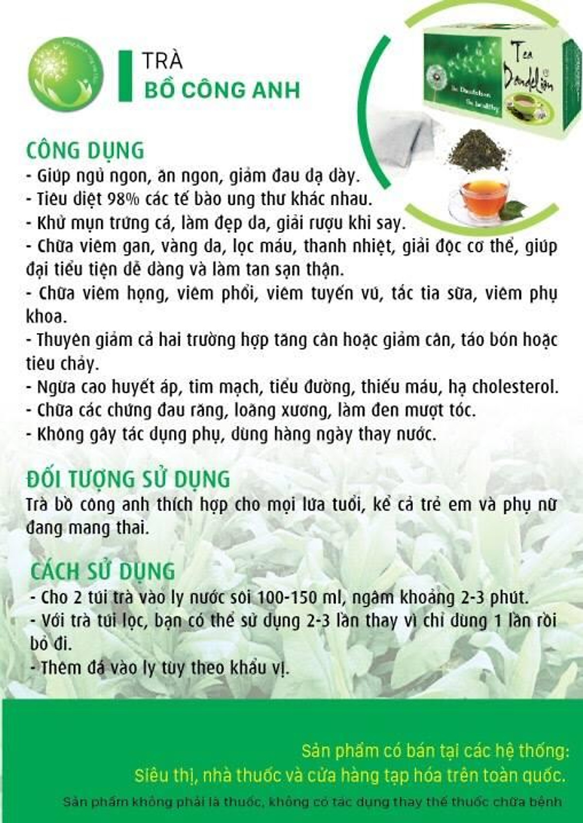 • Không chỉ là thức uống để thưởng thức như một thú vui tao nhã mà còn là dược liệu quý thiên nhiên ban tặng cho con người. Trà Bồ Công Anh túi lọc một thức uống quen thuộc theo dần với các xu hướng hiện tại. Được làm từ thân, lá và rễ cây bồ công anh tươi, được phơi khô sau đó đem xay nhuyễn cùng một ít lá cỏ ngọt (giúp trà có vị ngọt dịu, thơm mát) và cho vào từng túi nhỏ, với ưu điểm như vậy, trà bồ công anh mang lại sự tiện lợi cho người sử dụng và không phải lo lắng về thành phần của trà. Trong những ngày hè oi ả nóng bức như thế này, một ly trà bồ công anh sẽ mang lại cho bạn cảm giác “mát từ trong ra ngoài”, không những thế còn giúp cho hệ tiêu hóa hoạt động tốt, mát gan, lợi tiểu, đẹp da sẽ là những gì bạn sẽ cảm nhận được ngay sau khi uống Trà Bồ Công Anh.