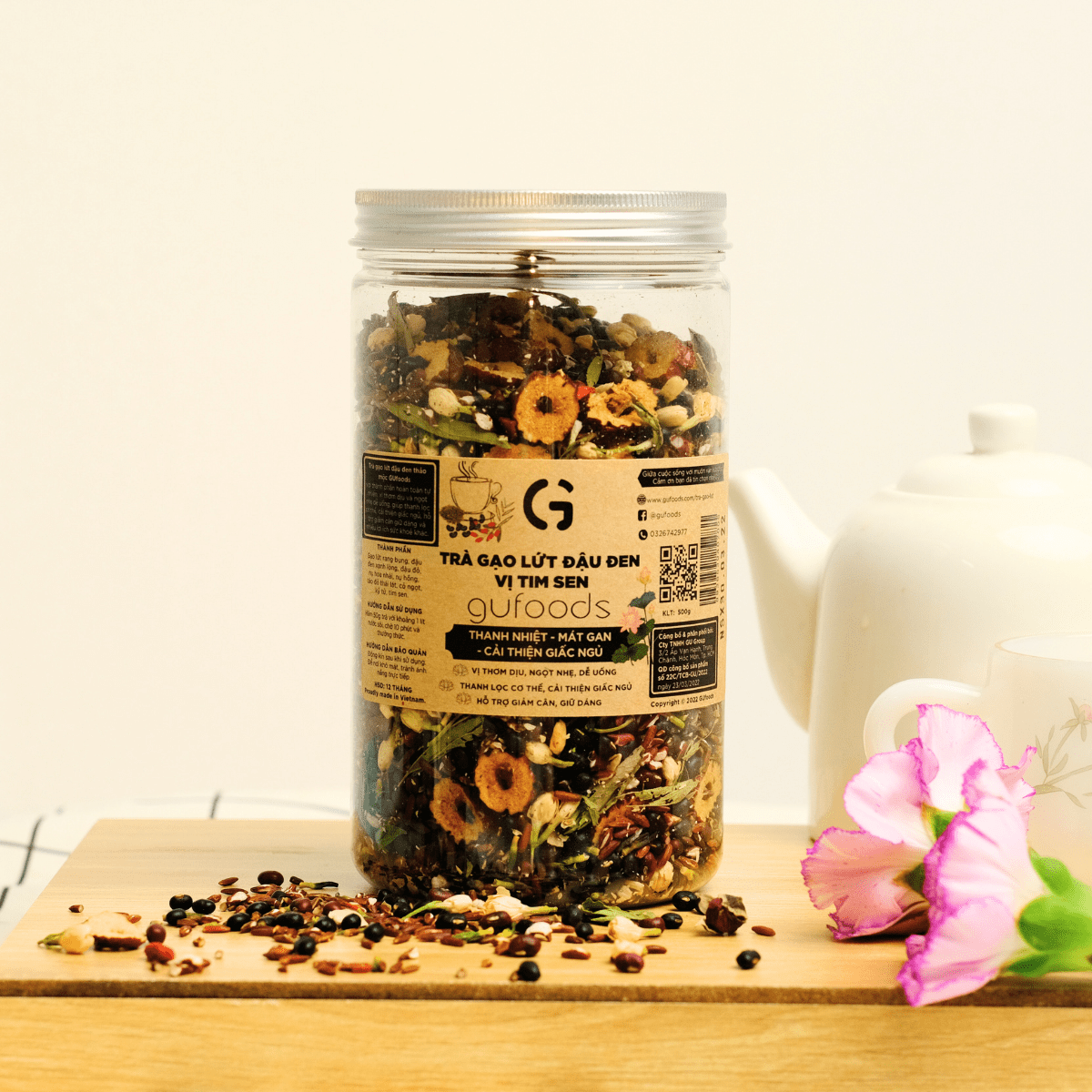 ✨Trà gạo lứt đậu đen vị Tim sen GUfoods (hũ 500g) - Thư giãn tinh thần, Thanh nhiệt, Mát gan, Cải thiện giấc ngủ, Thanh lọc cơ thể
