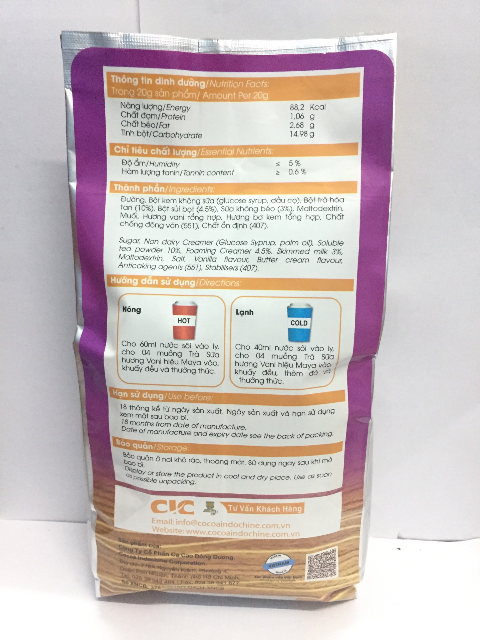 Thành phần: Sữa bò, đường, hồng trà, sữa bột nguyên kem, sữa bột tách béo, dextrin, muối, chất nhũ hóa, hương hồng trà tự nhiên, chất chống oxi hóa: Ascorbic Acid (L-) (E300) HDSD: Lắc