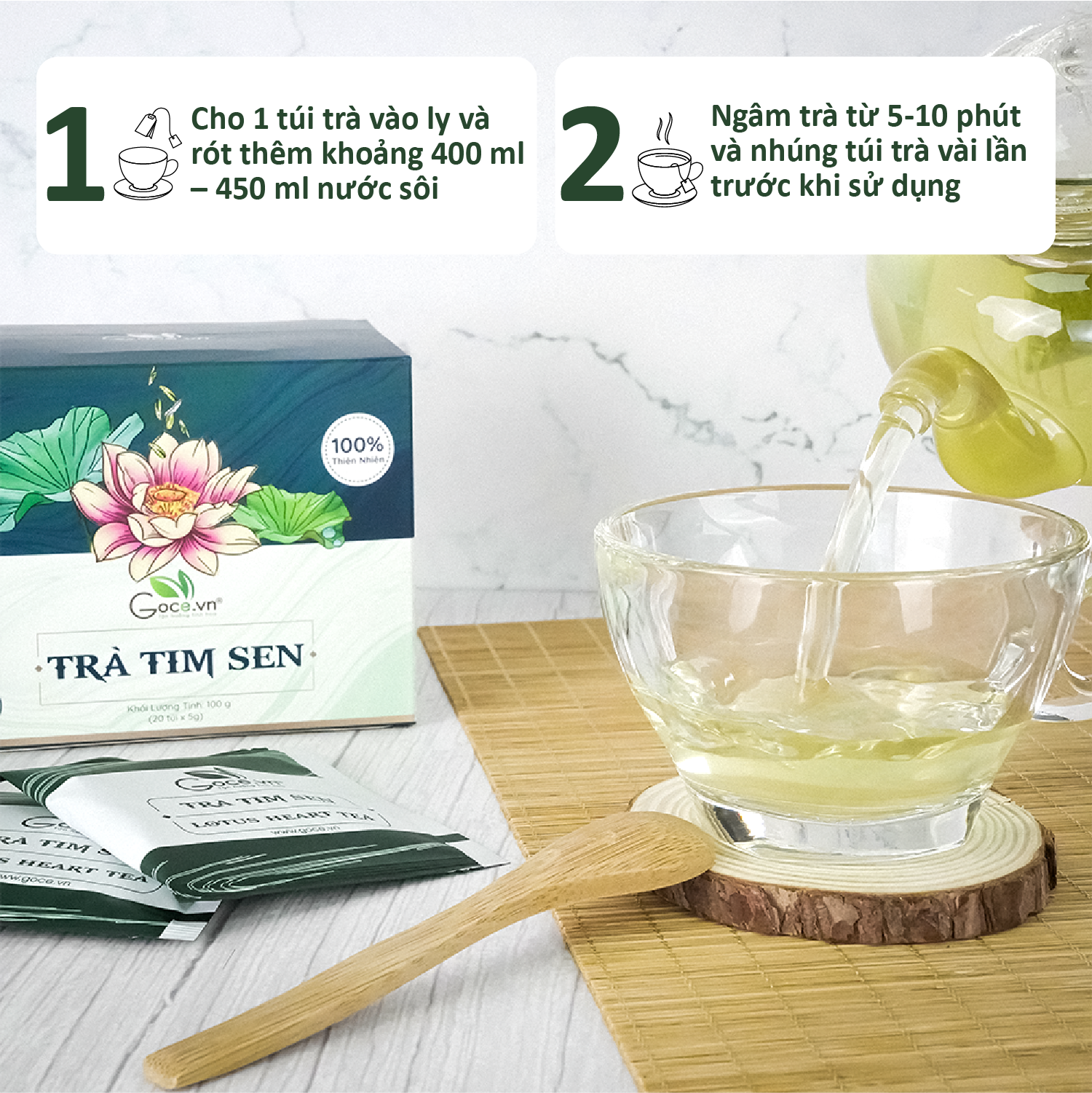 • Cho 1 túi trà tim sen (trà tâm sen) Goce vào ly