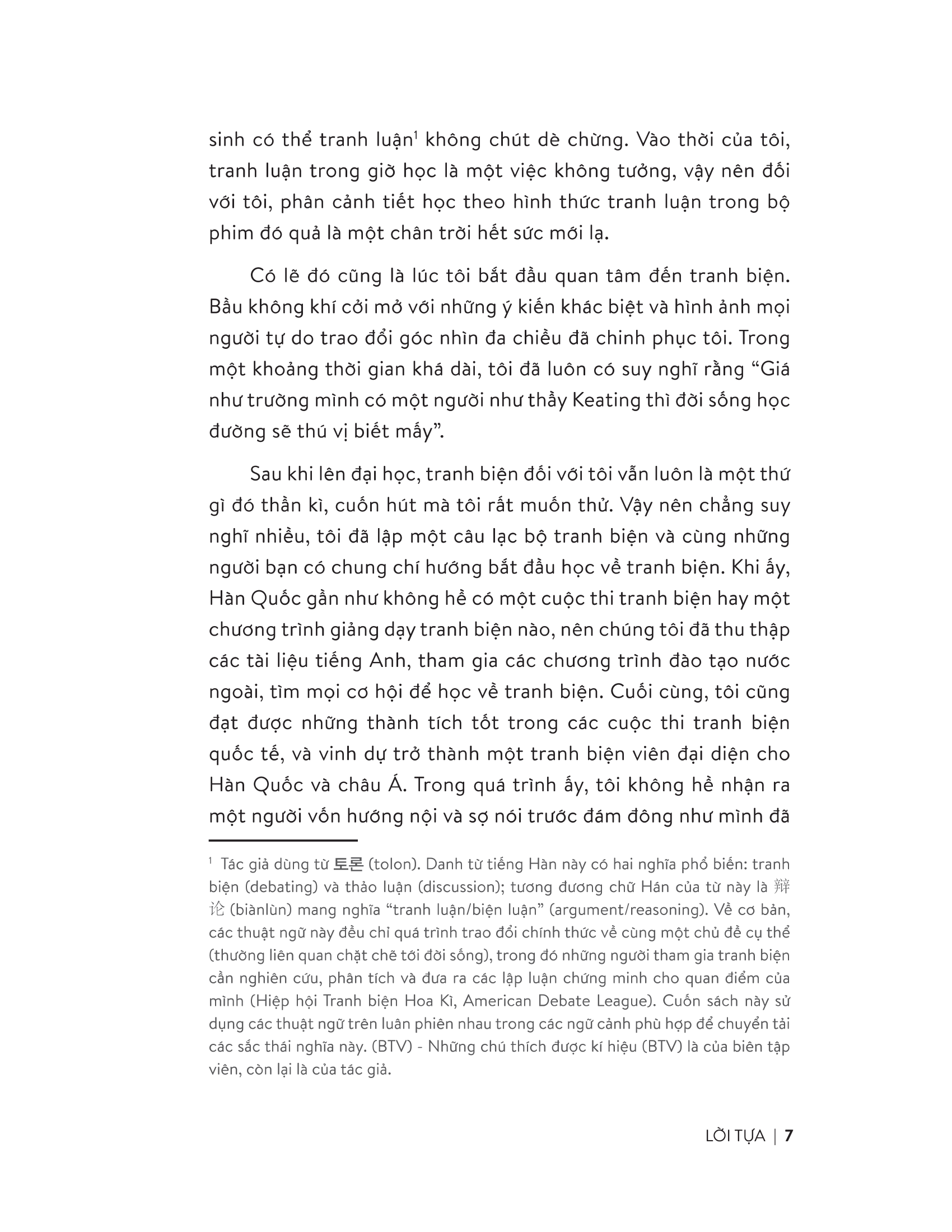 Tranh Biện Sao Cho Đúng Tranh biện sao cho đúng? là cuốn sách không chỉ đơn thuần đưa ra những kĩ năng để giành chiến thắng trên đấu trường tranh biện, nó còn nêu bật được ý nghĩa đích thực của tranh biện và giới thiệu một cách dễ hiểu về các phương pháp tranh biện để ai cũng có thể áp dụng vào học tập và công việc. Đối với nhiều người, tranh biện có lẽ là một thuật ngữ không mấy quen thuộc. Một số người có thể thấy nó đáng sợ, số khác lại thấy nó phi thực tế hoặc phiền toái. Nhưng trên thực tế, tranh biện hay tranh luận xảy ra trong mọi tình huống ở nhà, ở trường, ở nơi làm việc hay giữa bạn bè, và có thể nói kĩ năng tranh biện giờ đây quan trọng không kém gì kĩ năng đọc hay viết. Tranh biện là một kĩ năng sống thiết yếu. Nó mang lại cho chúng ta nhiều lợi ích, không chỉ bồi dưỡng năng lực học tập, mà còn tác động tích cực tới nhiều mặt khác trong cuộc sống như: khả năng giải quyết vấn đề, quá trình ra quyết định, bảo vệ quyền lợi cá nhân. Thông qua cuốn sách Tranh biện sao cho đúng?, người học có thể nâng cao năng lực tư duy phản biện, phân tích những khái niệm phức tạp, lập luận thấu tình đạt lí và thuyết phục người khác. Sách được chia thành 5 chương, mỗi chương xử lí những nội dung cần thiết theo từng giai đoạn. Chương 1 giải thích khái niệm tranh biện và lí do tại sao tranh biện lại cần thiết trong cuộc sống. Chương 2 trình bày các phương pháp nâng cao khả năng truyền đạt và kĩ năng thuyết trình trước khi chính thức bước vào tranh biện. Chương 3 tập trung vào các kĩ năng cơ bản trong tranh biện và các kĩ thuật có liên quan. Chương 4 đề cập đến quá trình chuẩn bị cho tranh biện và phương pháp phân tích kiến nghị. Chương 5 tổng kết những điểm cần lưu ý khi hoàn tất công tác chuẩn bị cho tranh biện và bước vào tranh biện thực tế. Đối tượng: Những người thường bị rối lời đuối lí khi tranh luận. Nhân viên văn phòng phải hệ thống nội dung trao đổi và truyền đạt ý kiến một cách logic trong các cuộc họp. Ứng viên chuẩn bị cho vòng phỏng vấn tranh luận. Học sinh trung học, sinh viên chuẩn bị tham gia các cuộc thi tranh biện. Người muốn rèn khả năng trình bày thuyết phục và logic về bất cứ chủ đề nào. Đôi nét về tác giả: Juseung Yi là người sáng lập và giám đốc điều hành của Debate For All, một doanh nghiệp xã hội trong lĩnh vực giáo dục tại Hàn Quốc. Anh từng giữ vai trò giám khảo chính của nhiều giải đấu tranh biện khác nhau trên khắp châu Á và là huấn luyện viên của đội tranh biện quốc gia Hàn Quốc. Juseung Yi được biết đến như một người tiên phong trong lĩnh vực giáo dục tranh biện ở Hàn Quốc. Anh đã tư vấn cho các tập đoàn, cơ quan truyền thông, sở giáo dục các tỉnh thành, trường đại học và các tổ chức để kết hợp các phương pháp tranh biện và tổ chức các sự kiện tranh biện và thuyết trình. Cuốn sách Tranh biện sao cho đúng? của Juseung Yi luôn đứng đầu danh sách sách bán chạy nhất của thể loại sách về tranh biện/đàm phán tại Hàn Quốc.