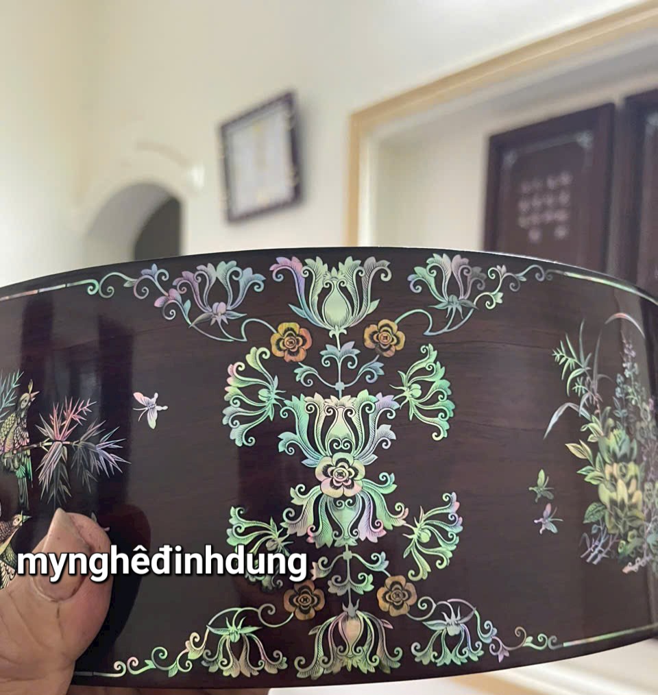 ✨Tráp tròn gỗ trắc khảm ốc đỏ kt mặt tròn 30 cao 11.6cm