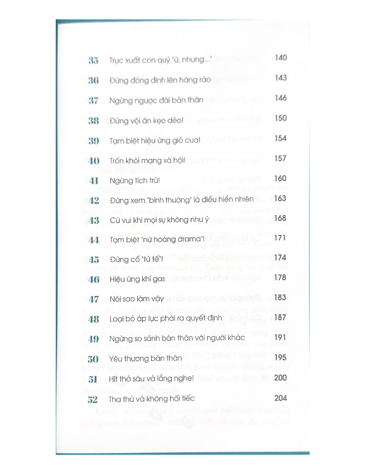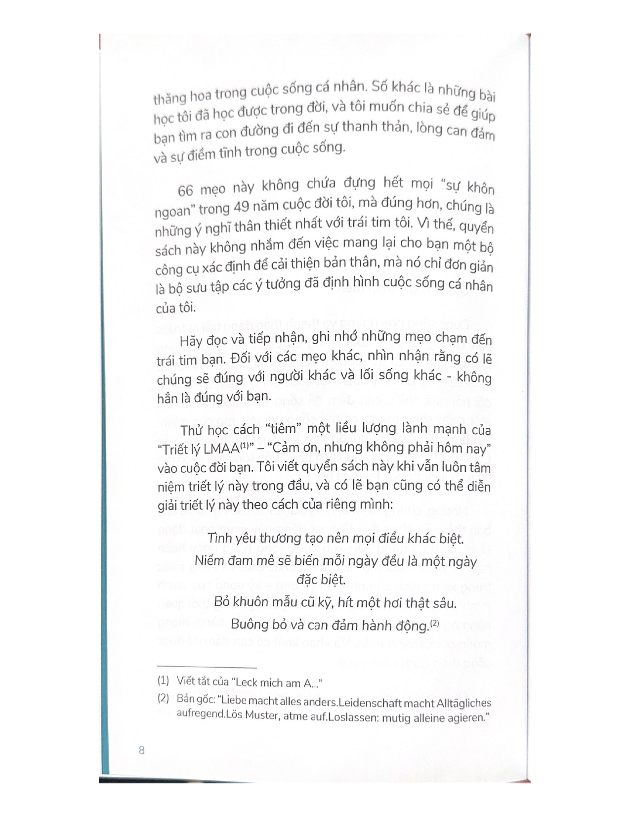 Để thoát khỏi vòng quay khổ sở này, ta phải học cách trở nên tốt đẹp hơn bằng cách thực hành Triết lý LMAA – “Cảm ơn, nhưng không phải hôm nay”. Hãy nói “LMAA” đối với những tham vọng thái quá khiến chúng ta mất động lực. Hãy nói “LMAA” đối với những đòi hỏi của người khác khiến ta phải sống một cuộc đời không đích thực. Hãy nói “LMAA” đối với những người đang ra sức dạy bảo ta “phải” sống như thế nào. Hãy nói “LMAA” đối với sự thôi thúc khiến ta luôn phải cố gắng sống tốt hơn và nhanh hơn. Hãy nói “LMAA” đối với cảm giác trách nhiệm và bổn phận đang đè nặng lên ta hằng ngày