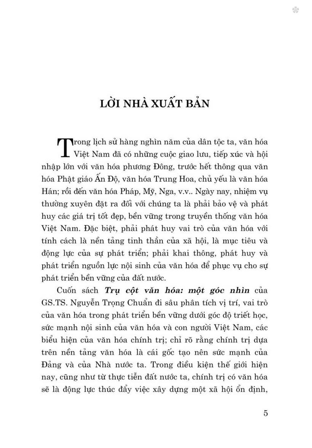 Cuốn sách “Trụ cột văn hóa: một góc nhìn” của GS.TS. Nguyễn Trọng Chuẩn đi sâu phân tích vị trí, vai trò của văn hóa trong phát triển bền vững dưới góc độ triết học, sức mạnh nội sinh của văn hóa và con người Việt Nam, các biểu hiện của văn hóa chính trị; chỉ rõ rằng chính trị dựa trên nền tảng văn hóa là cái gốc tạo nên sức mạnh của Đảng và của Nhà nước ta. Trong điều kiện thế giới hiện nay, cũng như từ thực tiễn đất nước ta, chính trị có văn hóa sẽ là động lực thúc đẩy việc xây dựng một xã hội ổn định, tự do, công bằng, bình đẳng, nhân văn, hạnh phúc và phát triển bền vững. Sức mạnh của chế độ, của chính quyền, của đảng chính trị cầm quyền chính là được tạo nên và dựa trên các cơ sở quan trọng này.