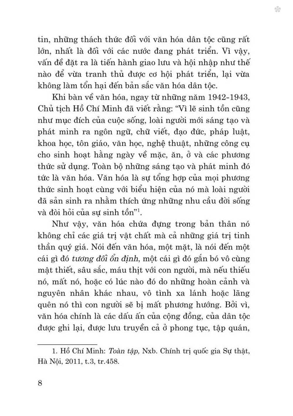 Đồng thời, tác giả cũng chỉ rõ rằng, nền tảng văn hóa là một trong những yếu tố quan trọng hàng đầu cấu thành chất lượng của cán bộ lãnh đạo và quản lý cấp chiến lược; sự nêu gương, sự dẫn dắt của các cán bộ này góp phần khơi dậy và phát huy các giá trị văn hóa sẽ thúc đẩy việc thực hiện khát vọng phát triển đất nước phồn vinh, nhân dân hạnh phúc. Tác giả cũng dành một phần dung lượng của cuốn sách để bàn về sự gắn kết giữa văn hóa với chính trị và kinh tế; về văn hóa doanh nghiệp và văn hóa kinh doanh; về văn hóa tôn giáo trong đời sống và sự phát triển của xã hội. Đây là những lĩnh vực quan trọng bậc nhất của quốc gia vì nó quán xuyến mọi hoạt động, từ cấp thấp nhất đến cấp cao nhất trong bộ máy công quyền, có nhiệm vụ duy trì và thúc đẩy sự phát triển bền vững mọi mặt từ kinh tế đến chính trị - xã hội của đất nước cũng như quan hệ đối ngoại trong điều kiện thế giới vô cùng phức tạp và đầy những biến động khó lường hiện nay.