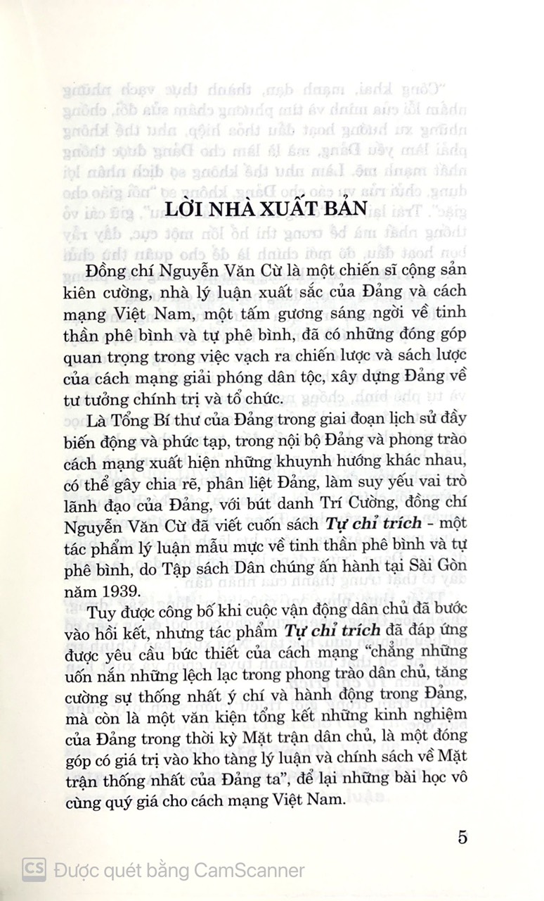 Là Tổng Bí thư của Đảng trong giai đoạn lịch sử đầy biến động và phức tạp, trong nội bộ Đảng và phong trào cách mạng xuất hiện những khuynh hướng khác nhau, có thể gây chia rẽ, phân liệt Đảng, làm suy yếu vai trò lãnh đạo của Đảng, với bút danh Trí Cường, đồng chí Nguyễn Văn Cừ đã viết cuốn sách Tự chỉ trích - một tác phẩm lý luận mẫu mực về tinh thần phê bình và tự phê bình, do Nhà sách Dân chúng ấn hành tại Sài Gòn năm 1939.