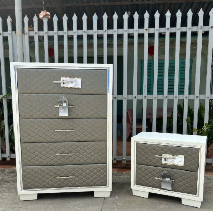 Khung Tủ màu trắng + mặt trước ngăn kéo bọc nệm màu trắng.