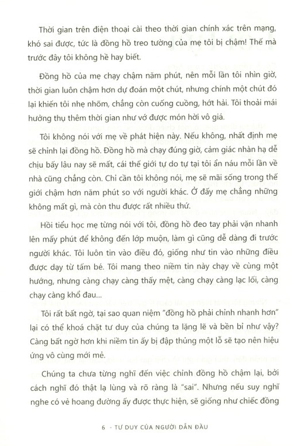 - Steve Jobs Trên thế giới, có rất nhiều người đã đạt được thành công của riêng mình, họ đều có bí quyết, nhưng họ cũng chẳng ngần ngại mà chia sẻ cho mọi người để học tập theo. Công thức của họ vô cùng đơn giản nhưng không phải ai cũng có thể thực hiện được: Tư duy khác người bình thường. TƯ DUY CỦA NGƯỜI DẪN ĐẦU – 7 YẾU TỐ ĐỂ TRỞ THÀNH NGƯỜI DẪN ĐẦU ĐÁM ĐÔNG đề cập đến bảy yếu tố không thể thiếu trong cuộc sống mỗi người, đó là thời gian, lựa chọn, hành động, học tập, tư duy, tài năng và thành công. Cuốn sách có thể giới thiệu đến bạn một vài điều quan trọng bạn chưa từng nghĩ đến, chưa từng nhìn ra. Chúng sẽ tác động đến hệ thống tư duy cố hữu của bạn, khiến hệ thống ấy rung chuyển và phát sinh nhiều khả năng mới, để bạn có thể trở thành người dẫn đầu đám đông. Không có người dẫn đầu bẩm sinh, chỉ có những người dẫn đầu được tạo ra giống như cách mọi thứ trên đời được thành hình, đó là trải qua trui rèn và cố gắng. TƯ DUY CỦA NGƯỜI DẪN ĐẦU – 7 YẾU TỔ ĐỂ TRỞ THÀNH NGƯỜI DẪN ĐẦU ĐÁM ĐÔNG không thể giúp bạn trưởng thành và đổi đời ngay lập tức nhưng sẽ đồng hành để chứng kiến sự thay da đổi thịt của bạn.