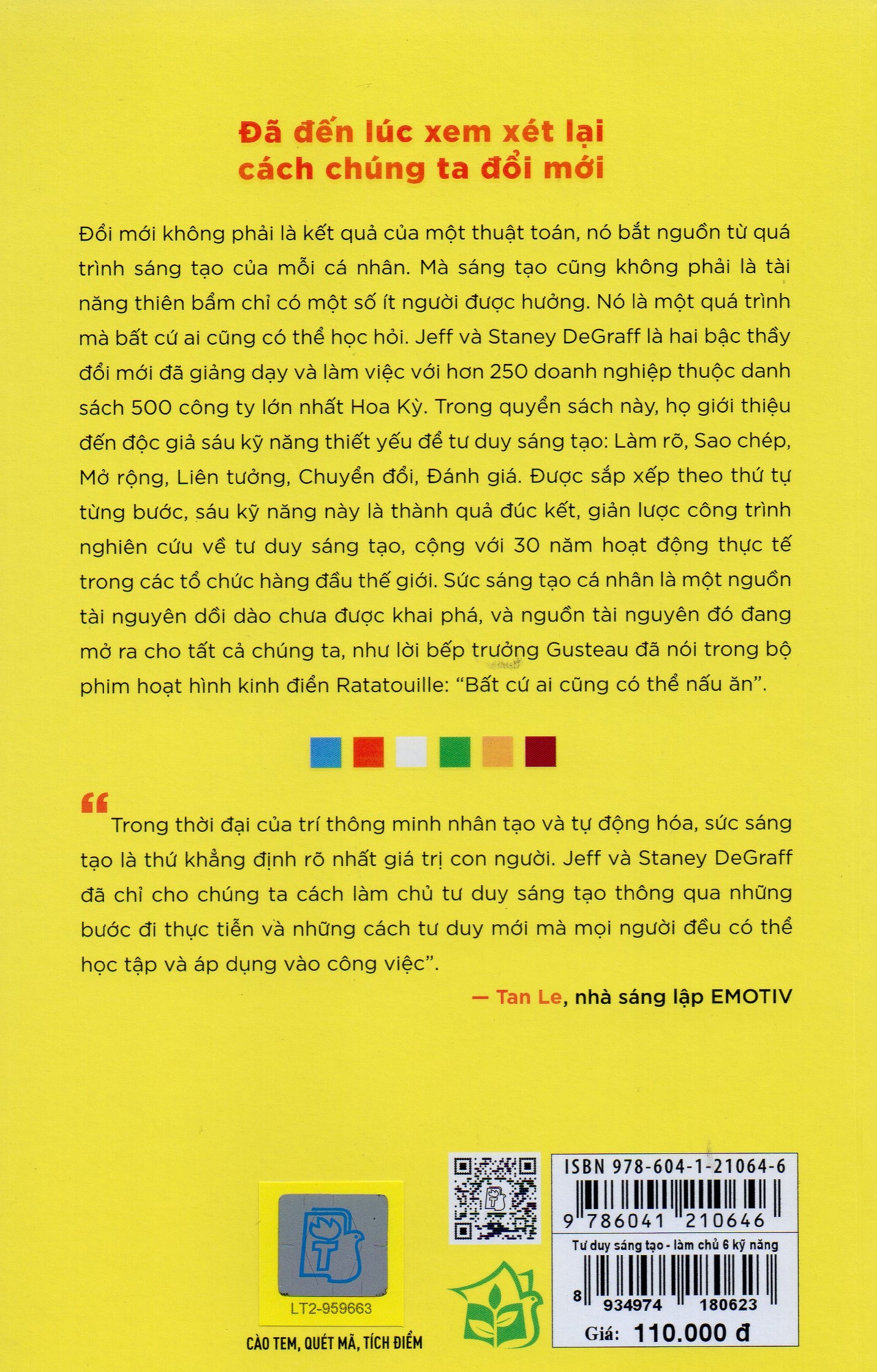 Trong quyển sách này, cùng với những bài thực hành lý thú, bạn sẽ được giới thiệu 6 kỹ năng tư duy sáng tạo cần thiết mà ai cũng có thể dễ dàng thành thạo và ghi nhớ gồm Làm rõ, Sao chép, Mở rộng, Liên tưởng, Chuyển đổi, Đánh giá. Đây là sáu thuật ngữ đã được cẩn thận lựa chọn để làm chìa khóa mở cửa tư duy sáng tạo. Chúng là tấm bản đồ dẫn lối bạn từ chỗ đề ra sáng kiến đến đạt được kết quả. Sáu kỹ năng này là thành quả từ sự đúc kết, tổng hợp, giản lược công trình nghiên cứu về tư duy sáng tạo, cộng với 30 năm hoạt động thực tế trong các tổ chức tân tiến hàng đầu thế giới.