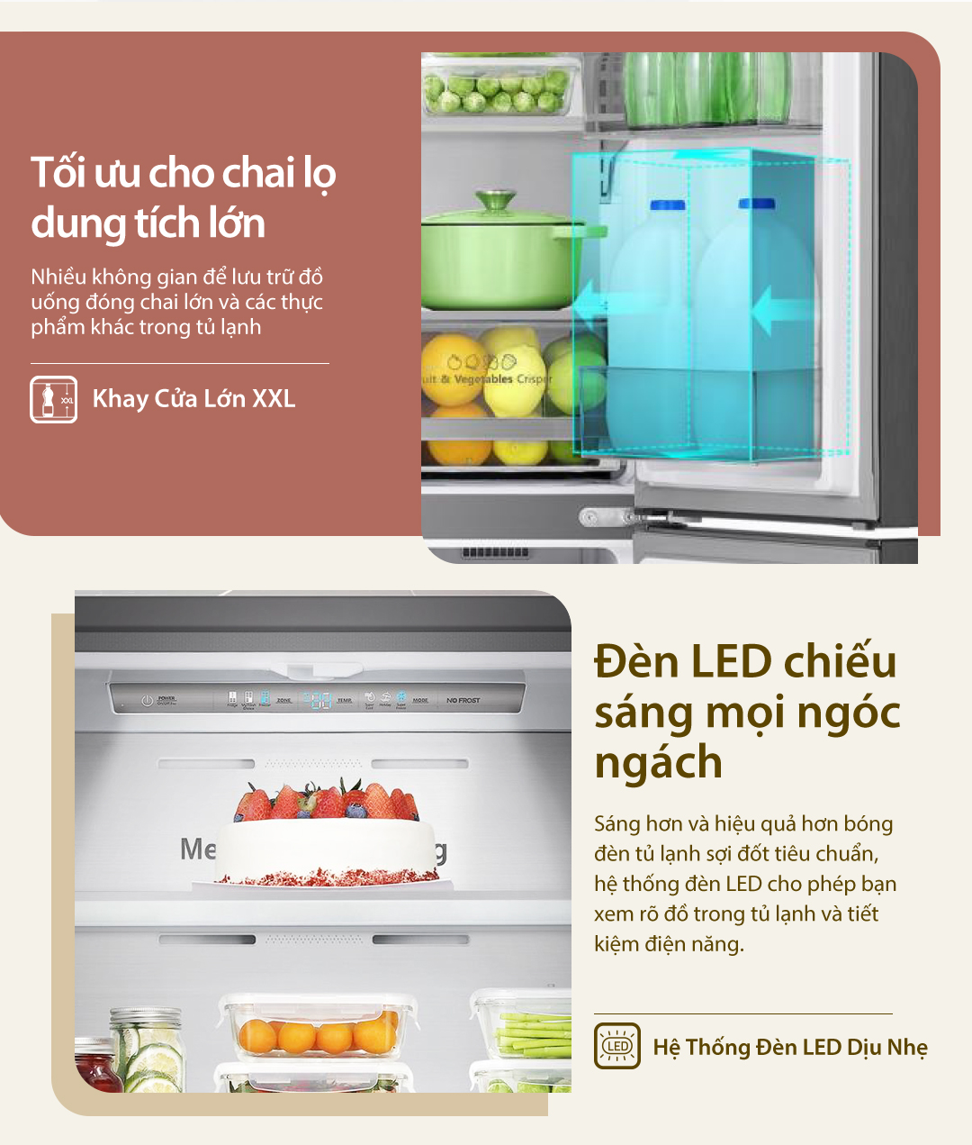 - Khay Cửa Lớn XXL: Nhiều không gian để lưu trữ đồ uống đóng chai lớn và các thực phẩm khác trong tủ lạnh