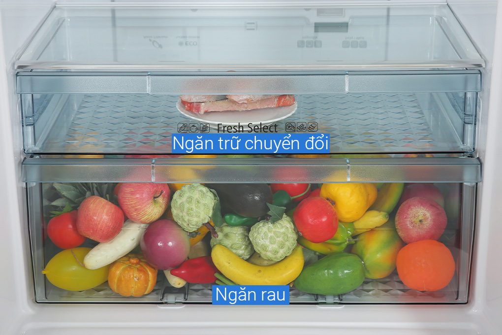- Ngăn trữ thịt cá và rau quả tươi: Cho phép tùy chỉnh 2 mức nhiệt để trữ rau quả hoặc trữ sữa/thịt, giữ lạnh tốt, cho thực phẩm và thức ăn tươi ngon lâu hơn mà không bị đông đá.