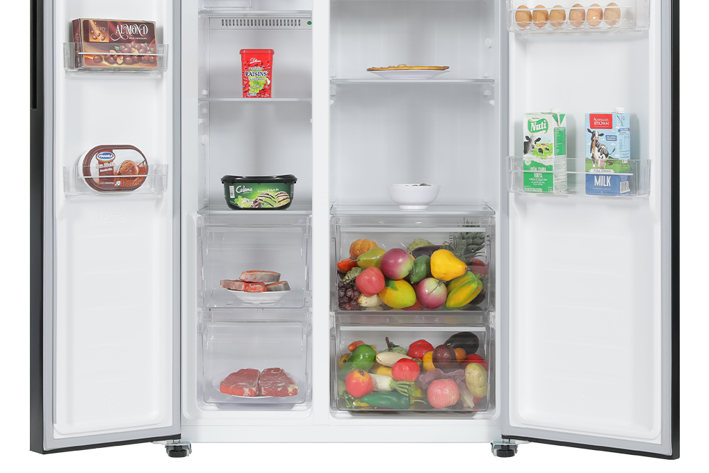 THÔNG TIN SẢN PHẨM - Kiểu tủ:Tủ lớn - Side by Side - 2 cánh - Dung tích sử dụng:519 lít - 4 - 5 người - Dung tích tổng:Hãng không công bố - Dung tích ngăn đá:185 lít - Dung tích ngăn lạnh:334 lít - Chất liệu cửa tủ lạnh:Mặt gương mờ - Chất liệu khay ngăn lạnh:Kính cường lực - Chất liệu ống dẫn gas, dàn lạnh:Ống dẫn gas bằng Đồng - Lá tản nhiệt bằng Nhôm - Năm ra mắt:2023 - Sản xuất tại:Trung Quốc Mức tiêu thụ điện năng - Công suất tiêu thụ công bố theo TCVN:520 kWh/năm - Công nghệ tiết kiệm điện:Inverter Công nghệ bảo quản và làm lạnh - Công nghệ làm lạnh:Luồng khí lạnh đa chiều Multi Air FlowCông nghệ 2 dàn lạnh độc lậpCông nghệ làm lạnh No Frost - Công nghệ bảo quản thực phẩm:Ngăn Moisture Fresh Crisper cân bằng độ ẩm - Công nghệ kháng khuẩn, khử mùi:Bộ lọc Anti Bacteria·Purify diệt khuẩn, khử mùi Tiện ích -