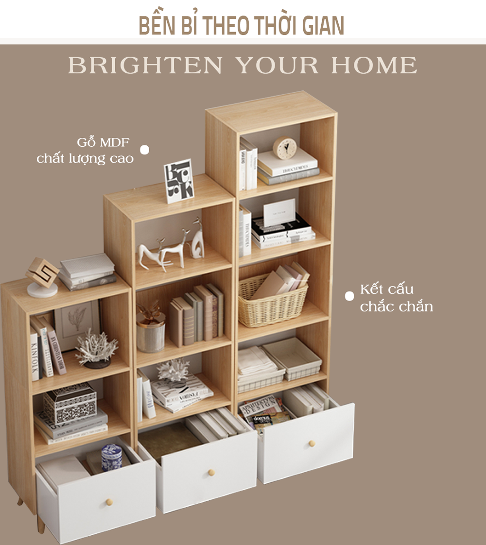 Tủ kệ sách có kết cấu bền chắc, chịu được khối lượng vật chứa cùng một lúc, hứa hẹn sẽ trở thành một trợ thủ đắc lực và là một món hàng nội thất trang trị tuyệt vời dành cho bạn.