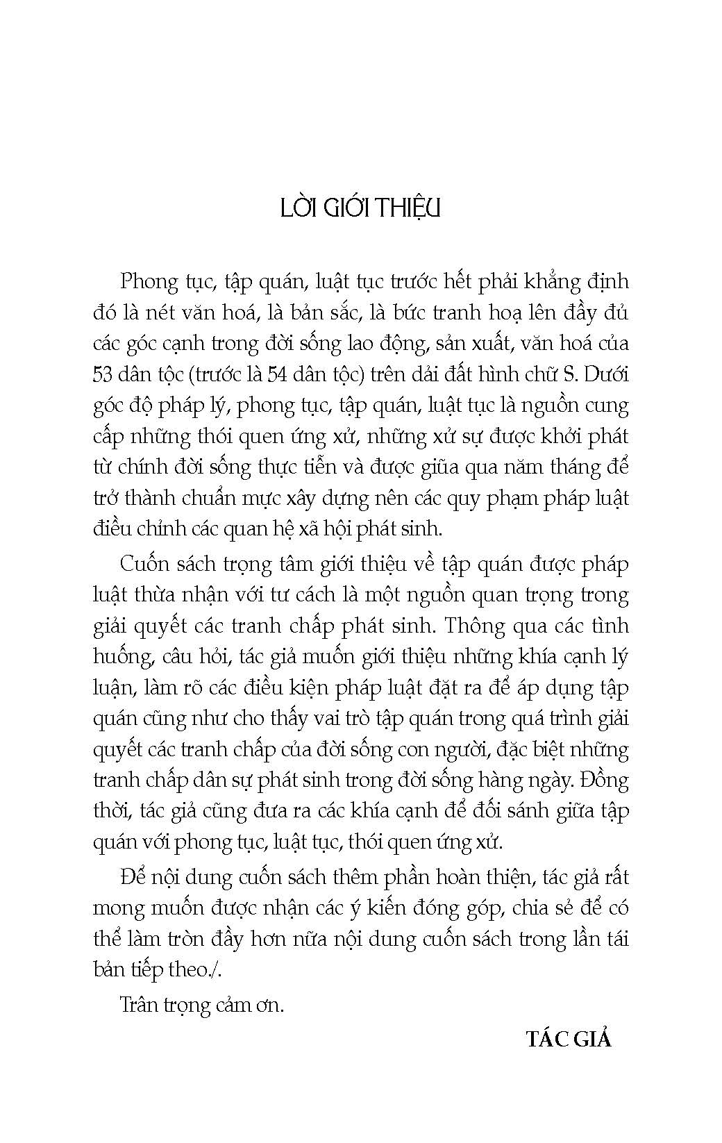 Cuốn sách trọng tâm giới thiệu về tập quán được pháp luật thừa nhận với tư cách là một nguồn quan trọng trong giải quyết các tranh chấp phát sinh. Thông qua các tình huống, câu hỏi, tác giả muốn giới thiệu những khía cạnh lý luận, làm rõ các điều kiện pháp luật đặt ra để áp dụng tập quán cũng như cho thấy vai trò tập quán trong quá trình giải quyết các tranh chấp của đời sống con người, đặc biệt những tranh chấp dân sự phát sinh trong đời sống hàng ngày. Đồng thời, tác giả cũng đưa ra các khía cạnh để đối sánh giữa tập quán với phong tục, luật tục, thói quen ứng xử.