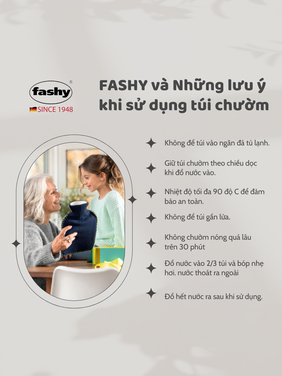 - Túi chườm nóng thương hiệu Fashy – Đức được thiết kế với kiểu dáng thời trang, rất tiện dụng và an toàn khi sử dụng.