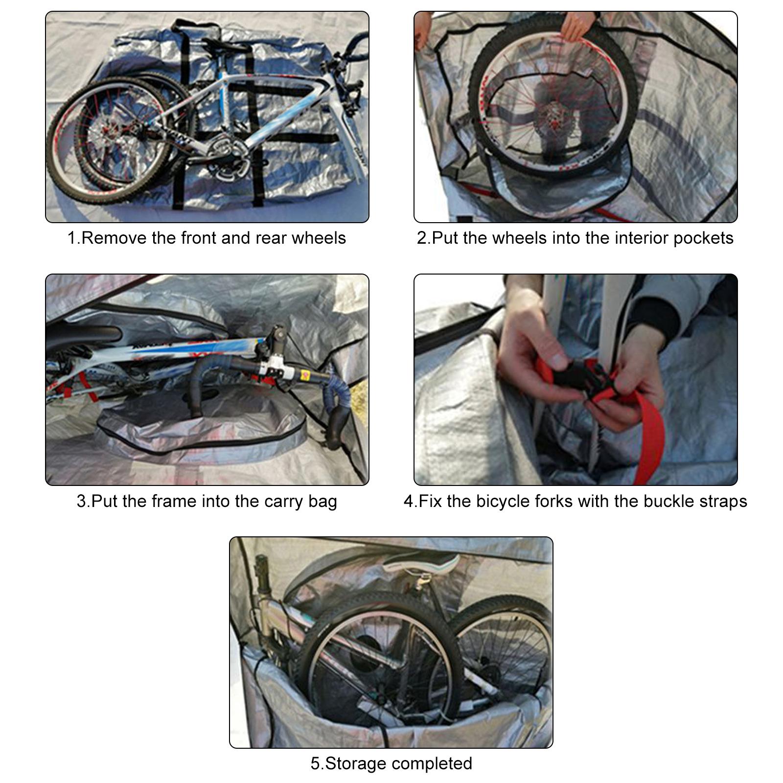 Features: Made from double-sided PE material, waterproof, dustproof and anti-scratch. Webbing reinforcement for enhanced durability. Interior zipper pockets designed for wheels; buckle straps for fixing bicycle forks. Enough space to fit for most bikes, suitable