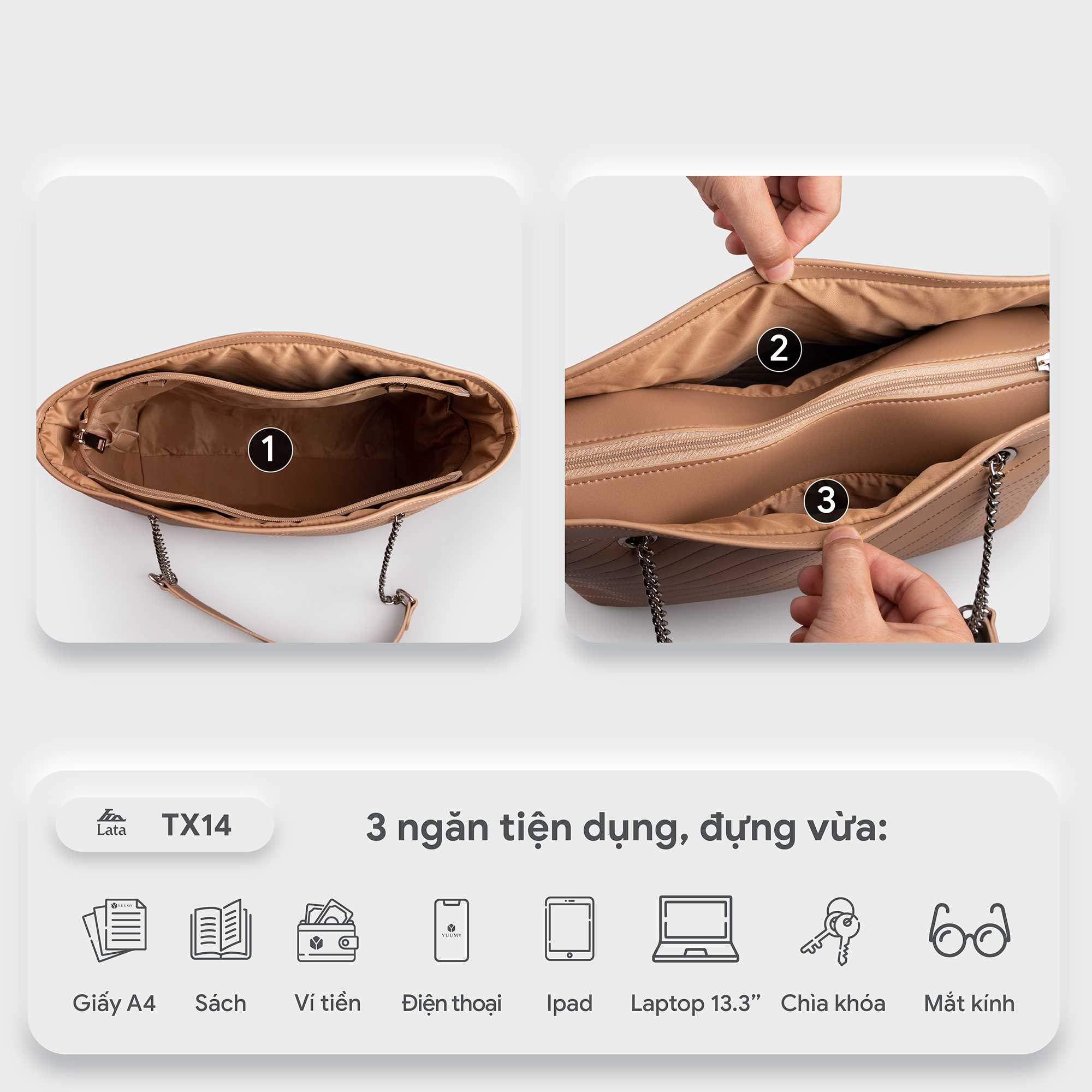 Túi xách nữ Yuumy YTX20 có thiết kế phù hợp cho người công sở dùng khi phải mang tài liệu đi làm mỗi ngày. Bên trong túi đựng vừa tài liệu A4, và các vật