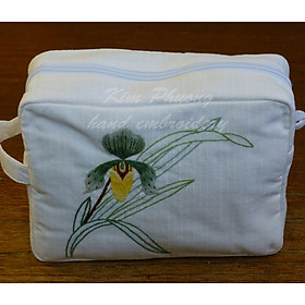 Sản phẩm Túi mỹ phẩm Mẫu LAN HÀI VÀNG Vải cotton Màu vải kem Kích thước chung rộng 16 x dài 23 x cao 7cm Hình dạng chữ nhật, có lót bên trong, dây kéo