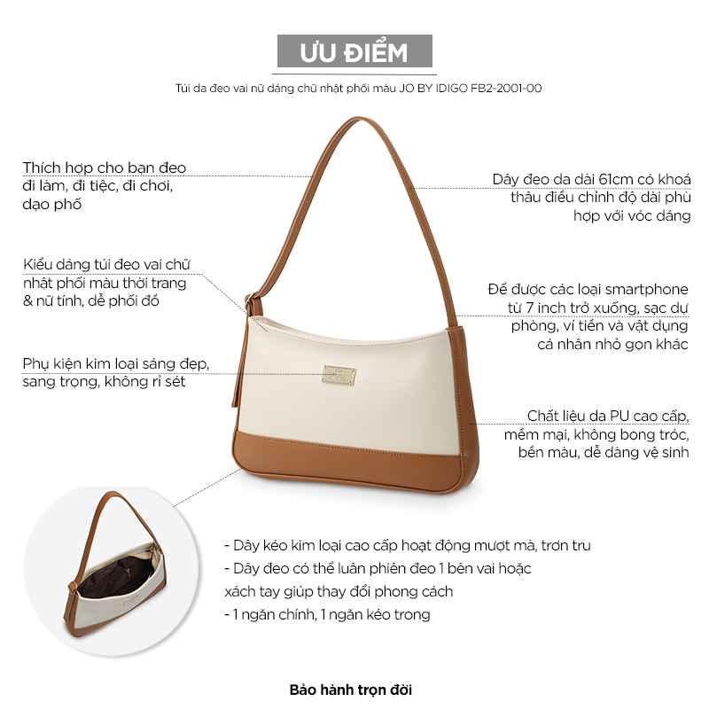 ✨Túi xách nữ đeo vai dáng chữ nhật, túi da công sở nữ phối màu thanh lịch JO BY IDIGO FB2 - 2001 - 00