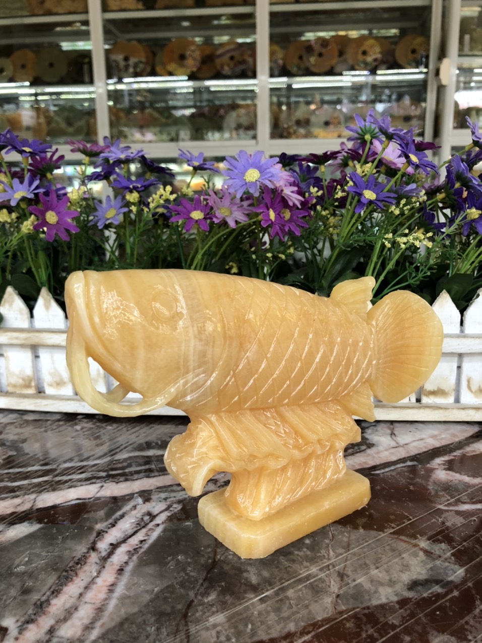 Chất liệu: Đá ngọc hoàng long Kích thước: Dài 30 cm x Rộng 10 cm x Cao 16,5 cm Khối lượng: 1,9 kg Do cá rồng là loài cá tượng trưng cho quyền lực oai