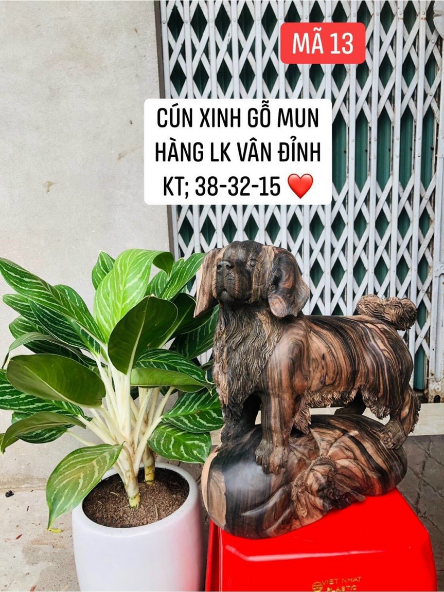Tượng con chó phong thủy được làm bằng chất liệu gỗ mun hoa liền khối tự nhiên 100%  Kich thước cao 38×32×15cm Tượng chó được trạm khắc vô cùng tỉ mỉ ,tinh sảo kỳ công .Đi hầu hết tất cả mọi chi tiết góc ngách của tượng ,đều được gọt tỉa chỉnh sửa hoàn toàn bằng tay thủ công .Đồng tượng được kiểm định kỹ lưỡng như cho vào thẩm sấy cho gỗ khô kiệt .Mục đích trống dập nứt vênh mo mối mọt .Kết hợp với trà nhám ,đánh giấy giáp nhiều nước cho sạch sẽ ,Rồi cho vào phun lót làm ,bóng mờ để giữ lại mầu sắc vân gỗ tữ nhiên .Tượng chó được làm và hoàn thiện do bàn tay khối óc tài hoa ,Từ những người thợ giàu kinh nghiệm ,Cũng như tay nghề cao trong làng nghề truyền thống .Chính vì thế tượng con chó đã đáp ứng đầy đủ những tiêu trí ( Đẹp bền rẻ ) Thẩm mỹ nghệ thuật với chất lượng tuyệt vời Tượng con chó trong phong thủy tượng trưng cho sự may nắm ,và trung thành trong phong thủy học .Chó cũng là vật để hóa giải sát khí trong nhà .Để cầu mong sự tốt lành .Tránh điều xấu dữ ,Nhưng ko để hình chó ở cửa chính mà để cửa ngách .Vì trấn thủ ở cửa lớn thông thường người ta sử dụng sư tử .
