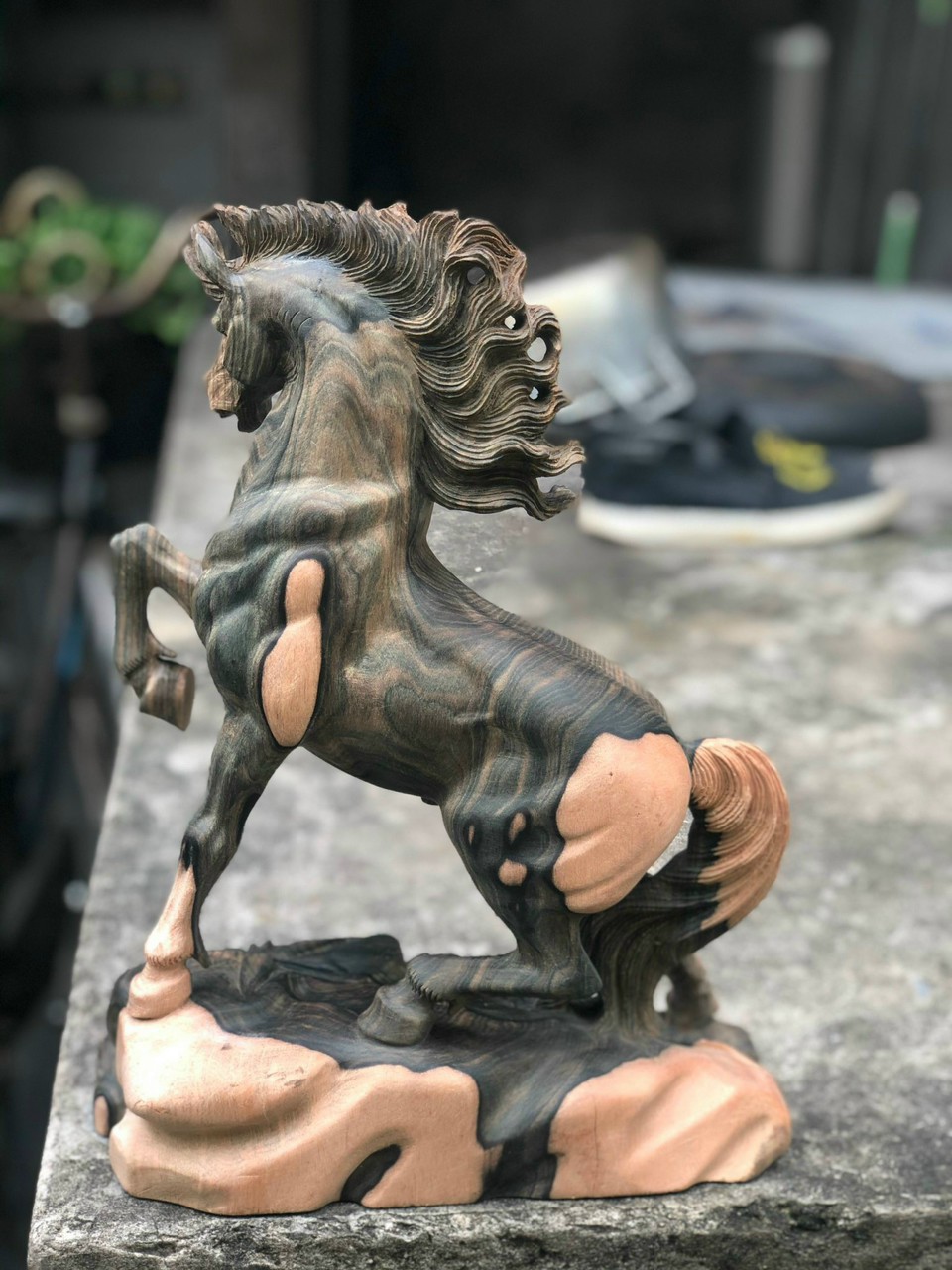 Tượng con ngựa trang trí phong thủy hút tài lộc ,được làm bằng chất liệu gỗ mun hoa liền khối tự nhiên 100% Kích thước cao 40cm _ Tượng con ngựa được trạm khắc ,tỉ mỉ ,tinh sảo kỳ công .Đi hầu hết tất cả mọi chi tiết góc ngách nội dung hoa văn của tượng ,đều được gọt tỉa chỉnh sửa hoàn toàn bằng tay thủ công ,Đồng thời tượng được kiểm định kỹ lưỡng ,Như cho vào thẩm sấy cho gổ khô kiệt .Mục đích trống dập nứt vênh mo mối mọt ,Kết hợp với trà nhám đánh giấy giáp nhiều nước ,sờ mát lạnh ,Rồi cho vào phun lót làm bóng mờ để giữ lại mầu sắc vân gỗ tự nhiên ,Tượng con ngựa trang trí phong thủy hút tài lộc .Được làm và hoàn thiện do bàn tay khối óc tài hoa ,Từ những người thợ giàu kinh nghiệm cũng như tay nghề cao trong làng nghề truyền thống .Chính vì thế tượng con ngựa đã đáp ứng đầy đủ những tiêu trí ( Đẹp bền rẻ ) Thẩm mỹ nghệ thuật với chất lượng tuyệt vời