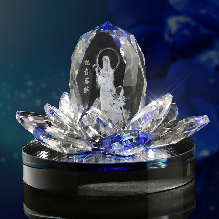 "Thuyết kinh, nhất đóa nhất tòa. Thơm lừng hương pháp, phật bà hóa duyên" chính là hình ảnh Quan Thế Âm Bồ Tát tọa sen hạ trần, ra tay cứu vớt chúng sinh lầm than, ban phước lành. Hình ảnh đẹp đẽ ấy đã được tái hiện lại trong sản phẩm tượng nước hoa quan âm. Tượng nước hoa quan âm được làm từ pha lê khối, được chạm khắc tinh xảo. Các chi tiết góc cạnh kết hợp tài tình, tỉ mỉ nên khi mặt trời chiếu vào, sẽ tạo ra những tia sáng lấp lánh, cực kì huyền ảo.